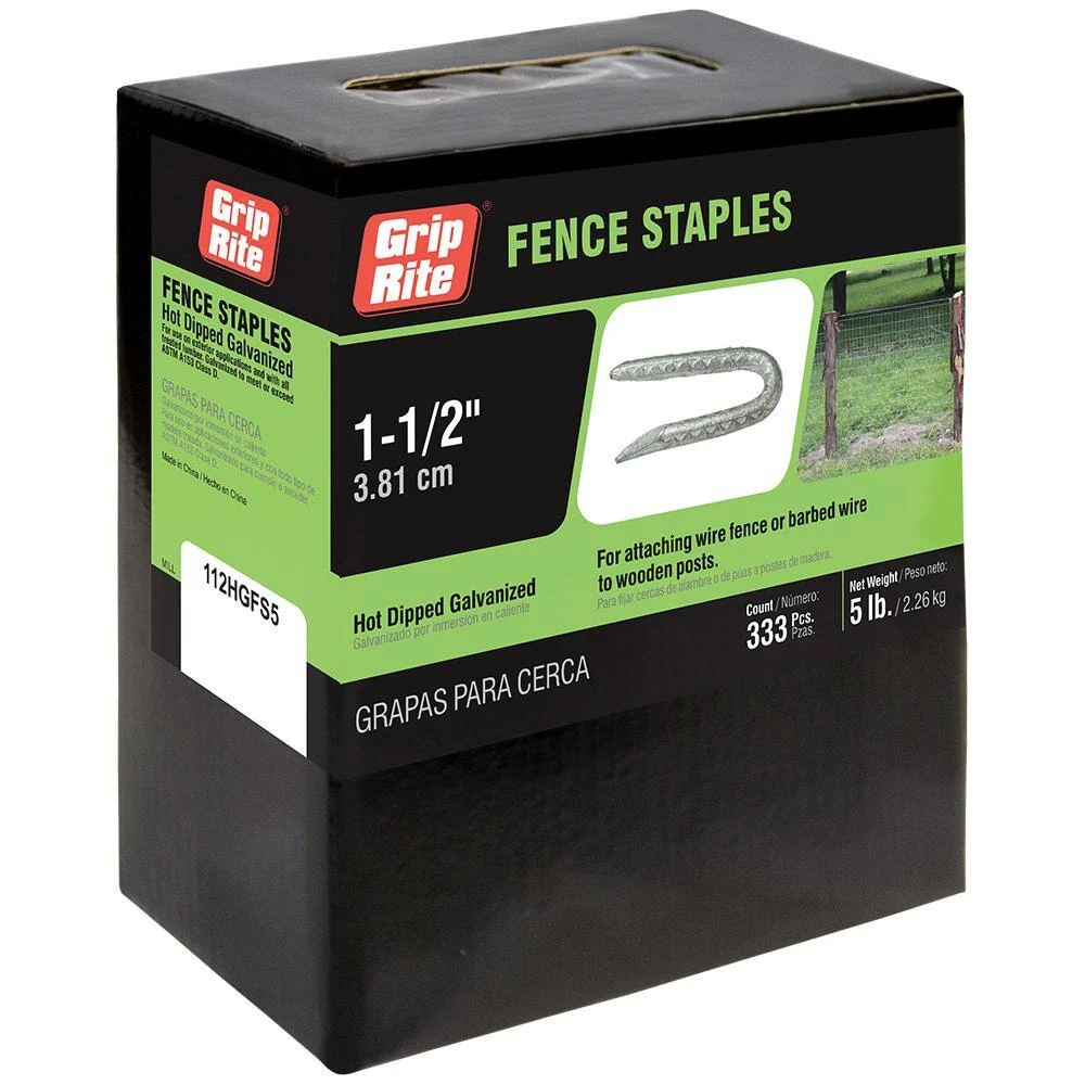 Grip-Rite 112FHS5 1-1/2 in. x 1/4 in. 9-Gauge Hot Dipped Galvanized Smooth Shank Fencing Staples are designed for use in fencing applications. Protected from the elements, these 1/4 in. crown fasteners are commonly used to attach wire-based fencing products to wood. Perfect for poultry netting, wire, and other fencing materials, these staples have a longer leg for increased holding power.