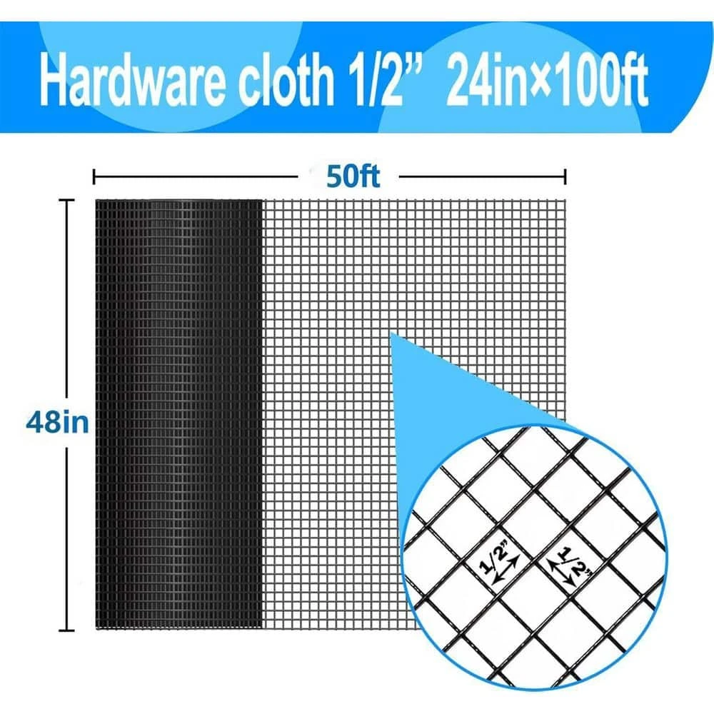 This black vinyl-coated hardware cloth is crafted from high-quality low-carbon steel wire through robust welding, with the iron wire surface coated in plastic for enhanced decoration. It has undergone numerous anti-corrosion, anti-rust, and wear-resistant experiments, ensuring effective resistance to rodent bites, even at the welding points. Measuring 1/2 in. x 1/2 in. square mesh and sized at 48 in. x 50 in. this product is suitable for various applications such as rabbit fences, chicken cages, dovecote hardware cloth, animal fences, tree protection covers, garden plant protection, and underground barriers. It effectively prevents damage to gardens or poultry from small wild animals like foxes, skunks, possums, eagles, groundhogs, and snakes, safeguarding your property safety. When purchasing, please select the appropriate width and mesh size according to your needs to avoid delaying its use. Each piece of hardware cloth comes with gloves for hand protection, and it is packed in a high-quality sturdy carton to prevent damage during transportation. For cutting, we recommend using specialized cutting tools such as bolt cutters or wire scissors.