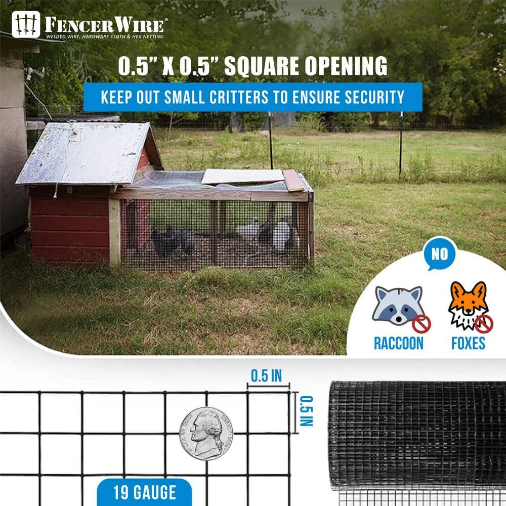 Fencer Wire 19 Gauge Black Vinyl Coated Welded Fence Wire Rolls, Mesh 1/2 in. x 1/2 in., Versatile Garden Wire Fencing, Hardware Cloth for Poultry, Chicken Coop, Home Improvement (3 ft x 100 ft.). The openings in the fence wire are limited to 1/2 in. to prevent critters and ensure the safety of chickens and rabbits. Black vinyl-coated and highly resistant to rust, our double zinc-coated hardware cloth ensures maximum rust resistance and a long lifespan. This versatile solution safeguards vegetables and flowers from tunneling animals. The chicken wire fencing half in. hardware cloth, also perfect for flower beds, wide gutters, fruit trees and vegetable gardens, effectively keeping out critters like voles, gophers and raccoons. Utilize this material to create a lining for the base of your chain-link fence.