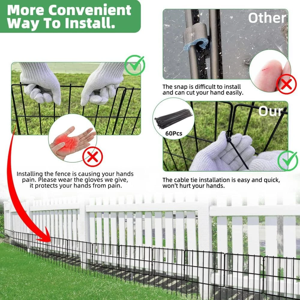 Our new animal barrier is carefully designed for you who love nature. No need to dig, easy installation, instantly build an indestructible protective line for your garden, lawn, vegetable garden boundaries, and path edges. We adopt advanced upgraded welding technology, double-layer design, and anti rust coating on the surface of the metal wire. Unique fence size upgrade, with a 20% increase in fence pole diameter, making it more sturdy and durable, so you don’t have to worry about bending or damage. The spacing between the spikes of the fence is only 1.65 in. , effectively preventing small animals from entering and leaving, completely bidding farewell to the troubles of digging holes and destruction. Whether it’s preventing pets from escaping or preventing damage from small animals such as rabbits and groundhogs, we can provide you with comprehensive solutions. We are well aware of the inconvenience during the installation process, so we have specially adopted a zip tie connection method, which is safe, convenient, and does not harm your hands, making it easy for you to complete the installation.