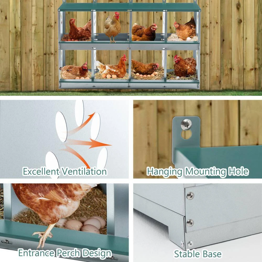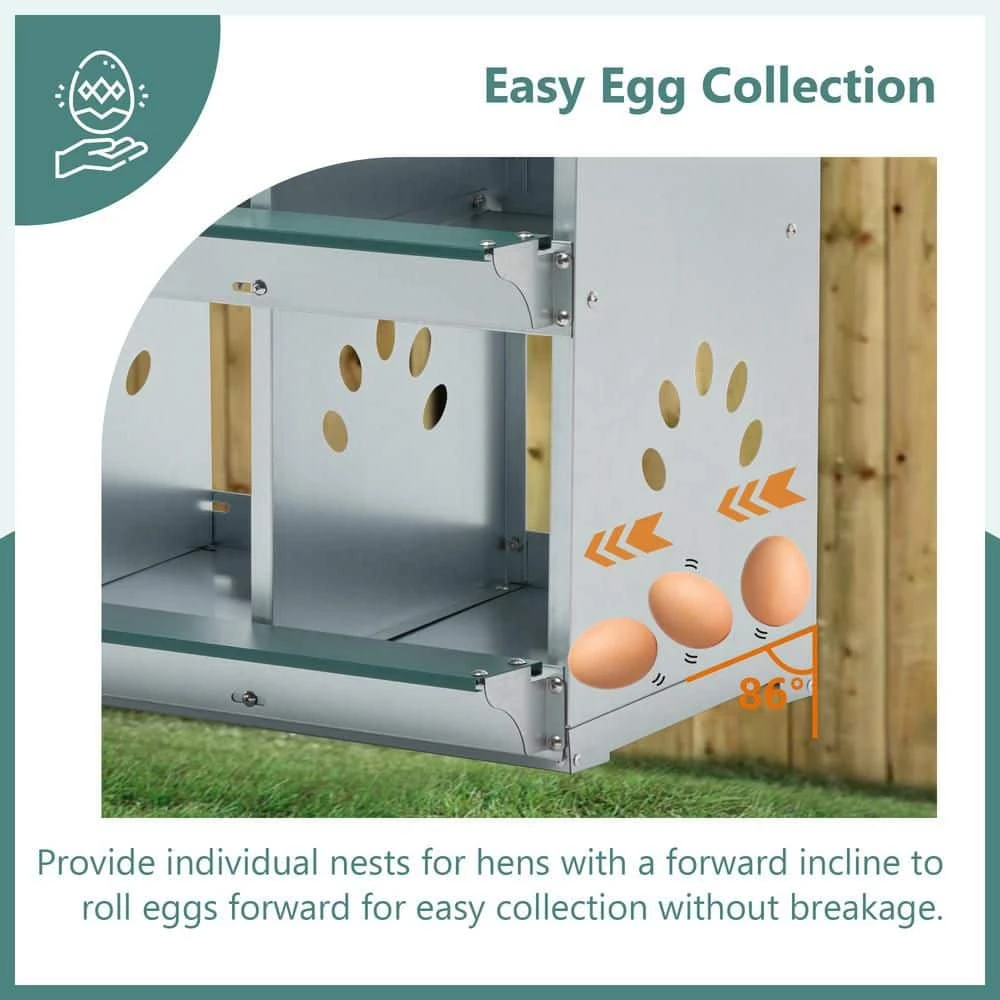 Our metal egg laying boxes are easy to clean and maintain. Simply rinse with a garden hose to keep them clean and provide a sanitary egg-laying environment for your hens. Our metal egg laying boxes come with screws that align perfectly with the pre-installed holes, ensuring easy assembly. Coupled with the simple and intuitive instruction manual, it only takes an adult 20 minutes to fully assemble the box and have it ready for use. Our chicken nest box is 42.52 in. long, 16.34 in. wide, and 26.38 in. high. The chicken nest provides a comfortable, safe, and sheltered space for chickens, making them feel safe and secure, and increasing their egg-laying rate. The side design with ventilation holes can increase ventilation and make chickens feel relaxed. The chicken nest bottom plate is designed with a slight tilt, which allows your precious eggs to roll forward under the secure lid until you are ready to collect them, and the eggs will be intact. We recommend placing some padding under the lid of the egg collection box to further protect the eggs from collisions.