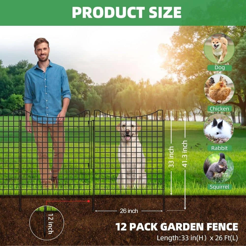 - Installation is a breeze with this package, which includes 12 panels, 13 stakes, and 1 lock, each 33H x 26W panel connects to form a 26 ft. fence, with a lock to create a door if desired