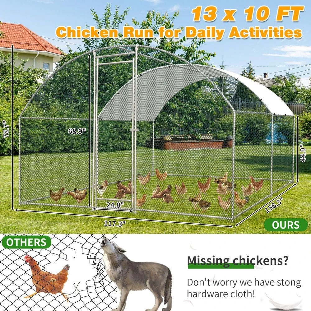 The 13.1 x 9.8 x 6.5 ft. Arc-Top Poultry Coop, the perfect solution for raising chickens, rabbits, or other small animals. Designed with durability and convenience in mind, this spacious coop is constructed with high-quality galvanized steel pipes and features a sturdy PE rainproof cover to protect your animals from the elements. The arc-top design not only enhances structural stability but also ensures efficient water runoff during rainy weather.The coop comes with a metal wire cage that provides a secure and comfortable environment for your poultry or small pets. Its modular design allows for easy assembly and disassembly, making it ideal for both permanent and temporary setups. Whether you’re a hobbyist or a small-scale farmer, this versatile and reliable coop is a must-have for your backyard or farm.
