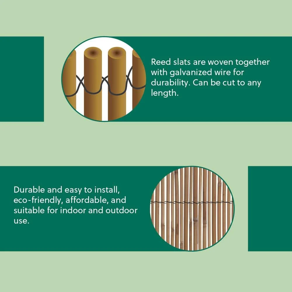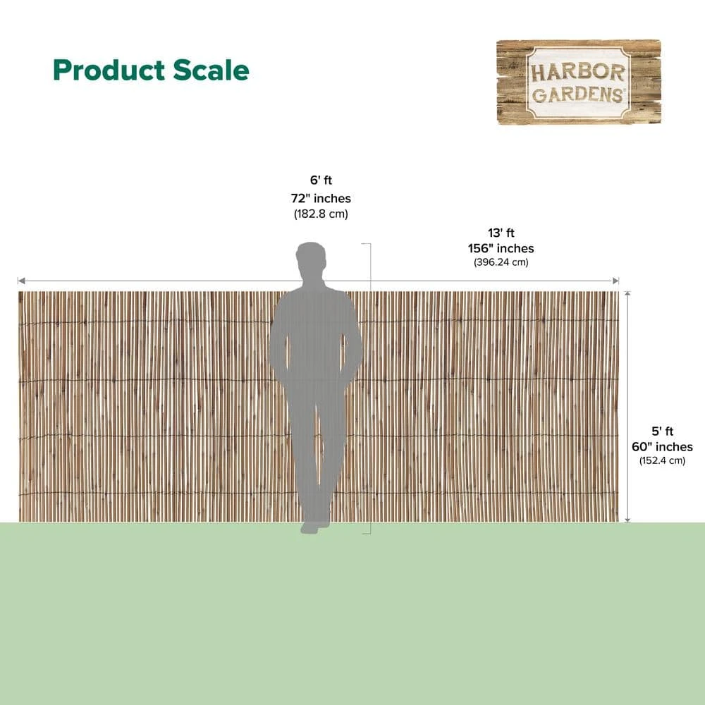 Harbor Gardens R645HG Reed Garden Fencing. This 100% natural Reed fencing makes an ideal cover for unsightly areas or to enhance gardens, yards and decks. Its natural look will blend with any setting. Use as boundary fencing or as screening to create areas within gardens. Use over arbors and pergolas to softly filter sunlight creating a shaded area underneath. Ideal for Japanese gardens. Durable and easy to install, simply attach to fence uprights with ties or staples. Banded with galvanized wire for durability. dimensions: 13 ft. L x 5 ft. H. Also available from Harbor Gardens in 2 other heights (sold separately): 3 ft. 3-R644HG and 6 ft. 6-R668HG.