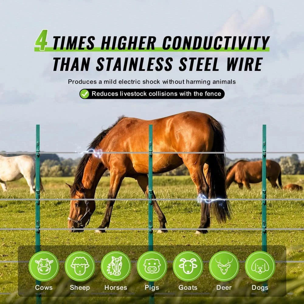 Electric Fence Wire. This fence wire is made from high-strength aluminum alloy, offering conductivity that is 4 times greater than stainless steel wire. It provides fast and stable electrical transmission, creating an effective psychological barrier to prevent livestock from escaping and deterring wild animals from intruding. The aluminum alloy material is lightweight, rain-resistant, UV-resistant, and durable, with resistance to breaking. With a length of up to 1640 ft. /500m, it is ideal for large-area farms and easy to install. Compatible with all electric fences, this fencing material is perfect for constructing horse fences, dog electric fences, and goat electric fences, making it the best choice for portable fencing.