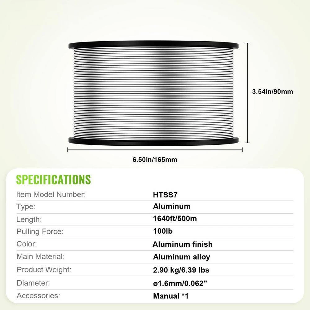- Specifications: item model number: htss7, L.: 1640 ft./500m, pulling force: 100 lbs., color: aluminum color, main material: aluminum, product weight: 2.90kg /6.39 lbs.