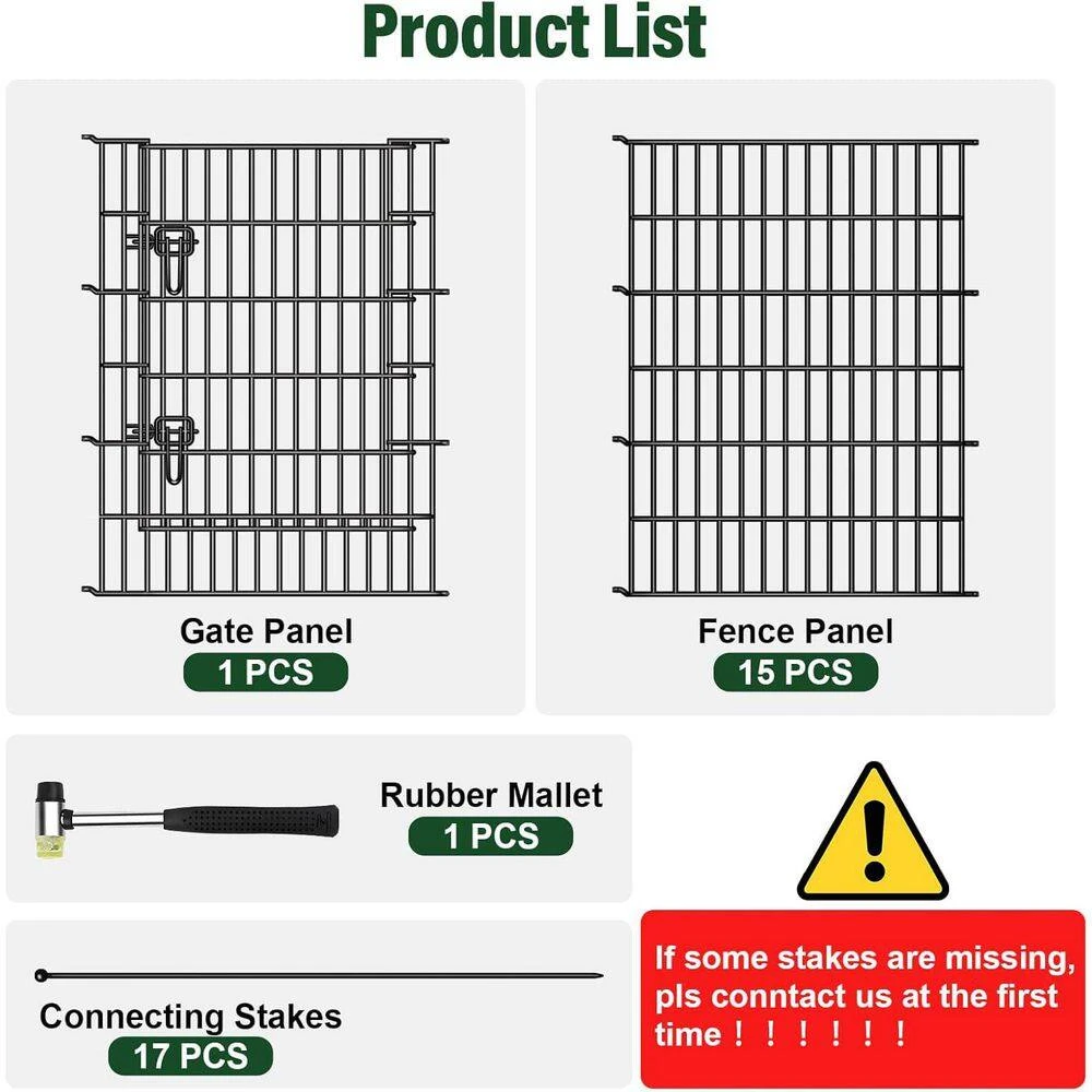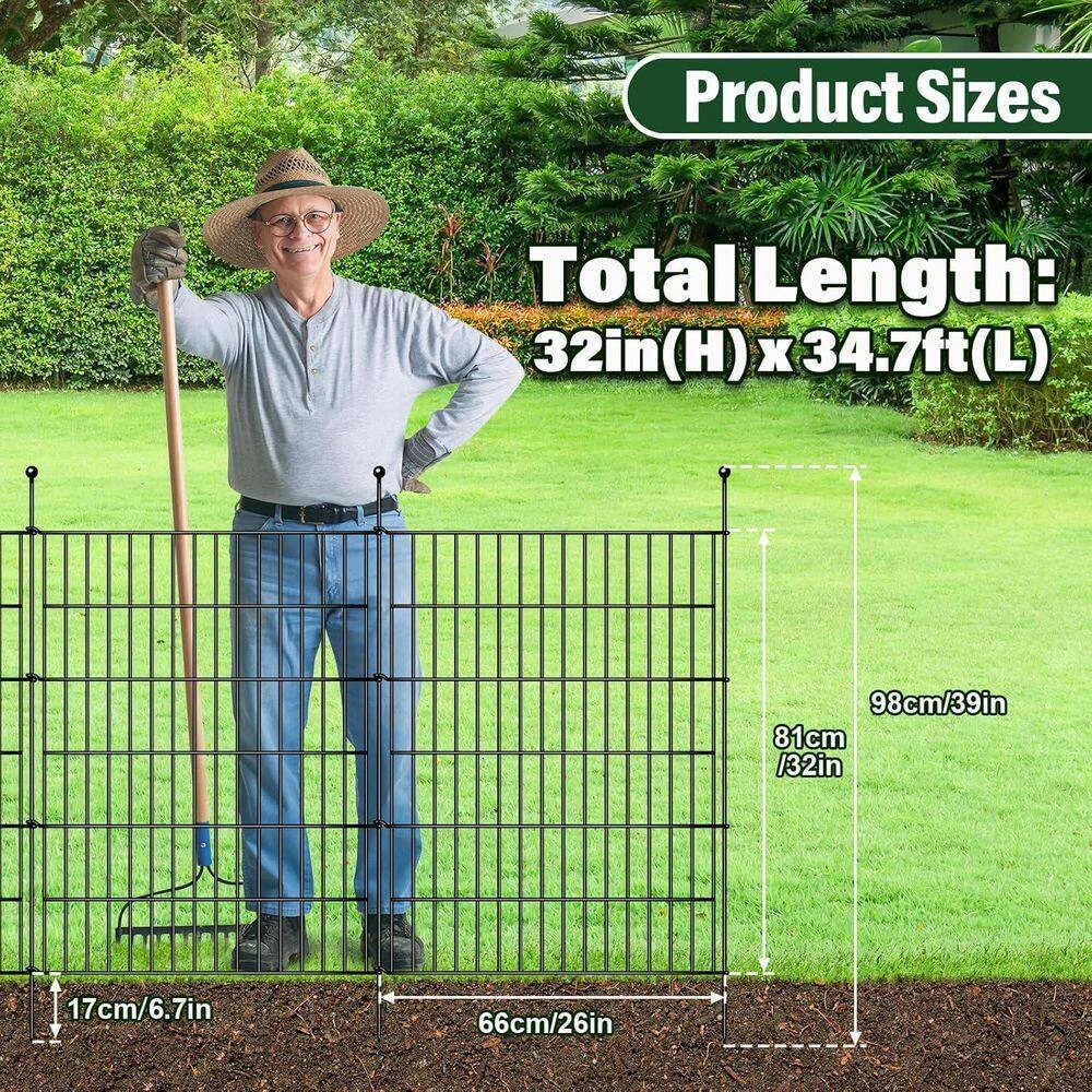 - Garden fence set includes 15 fence panels, 1 gate panel, 17 stakes, and 1 rubber mallet, offering a total length of 34.7 ft. and a height of 32 in. providing excellent protection for your space, made with high-quality iron wire, the metal garden fence is rust-resistant and durable, ensuring a long lifespan and less maintenance, so you can enjoy your garden worry-free for years