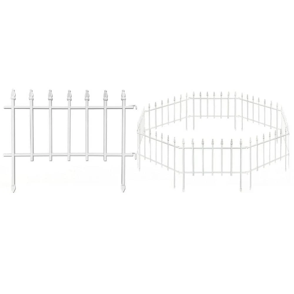 Perfect for your outdoor space, this decorative garden border fence is both functional and stylish. Each fence piece measures 22 in. W x 18 in. H, and a pack contains 5 fence pieces with a total length of 9.17 ft. Its versatile design allows you to create beautiful borders around plants, walkways, patios or flower beds, while also serving as a small pet fence or garden edge. This modern style wrought iron fence is easy to install without any tools, enhancing the elegance of your yard while keeping it neat and organized.