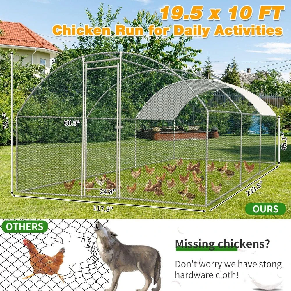 The 19.7 ft. x 9.8 ft. x 6.5 ft. Arc-Top Poultry Coop, the perfect solution for raising chickens, rabbits, or other small animals. Designed with durability and convenience in mind, this spacious coop is constructed with high-quality galvanized steel pipes and features a sturdy PE rainproof cover to protect your animals from the elements. The arc-top design not only enhances structural stability but also ensures efficient water runoff during rainy weather. The coop comes with a metal wire cage that provides a secure and comfortable environment for your poultry or small pets. Its modular design allows for easy assembly and disassembly, making it ideal for both permanent and temporary setups. Whether you’re a hobbyist or a small-scale farmer, this versatile and reliable coop is a must-have for your backyard or farm.