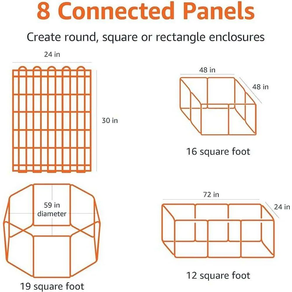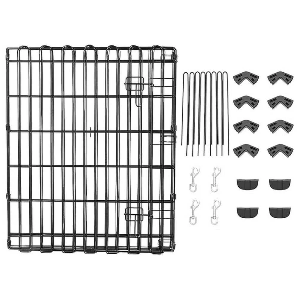 This 30-inch extra-small exercise playpen (without a door) is designed for dogs up to 20 inches tall or other small pets. Made of durable rust-proof iron wire, it includes 8 connectable panels with thumb clips for joining the ends together and 8 ground anchors for secure outdoor placement. The pen can be easily configured into multiple standalone shapes (round, square, rectangle) for playtime or to block off a room. It sets up in seconds; simply unfold, shape, and connect without the need for tools, and it folds flat for easy transportation and storage. Please note that pets should not be left unattended outdoors. Product dimensions include a round shape of 60x60x30 inches (LxWxH) or a square shape of 48x48x30inches (LxWxH), with each panel measuring 24×24 inches (LxH).