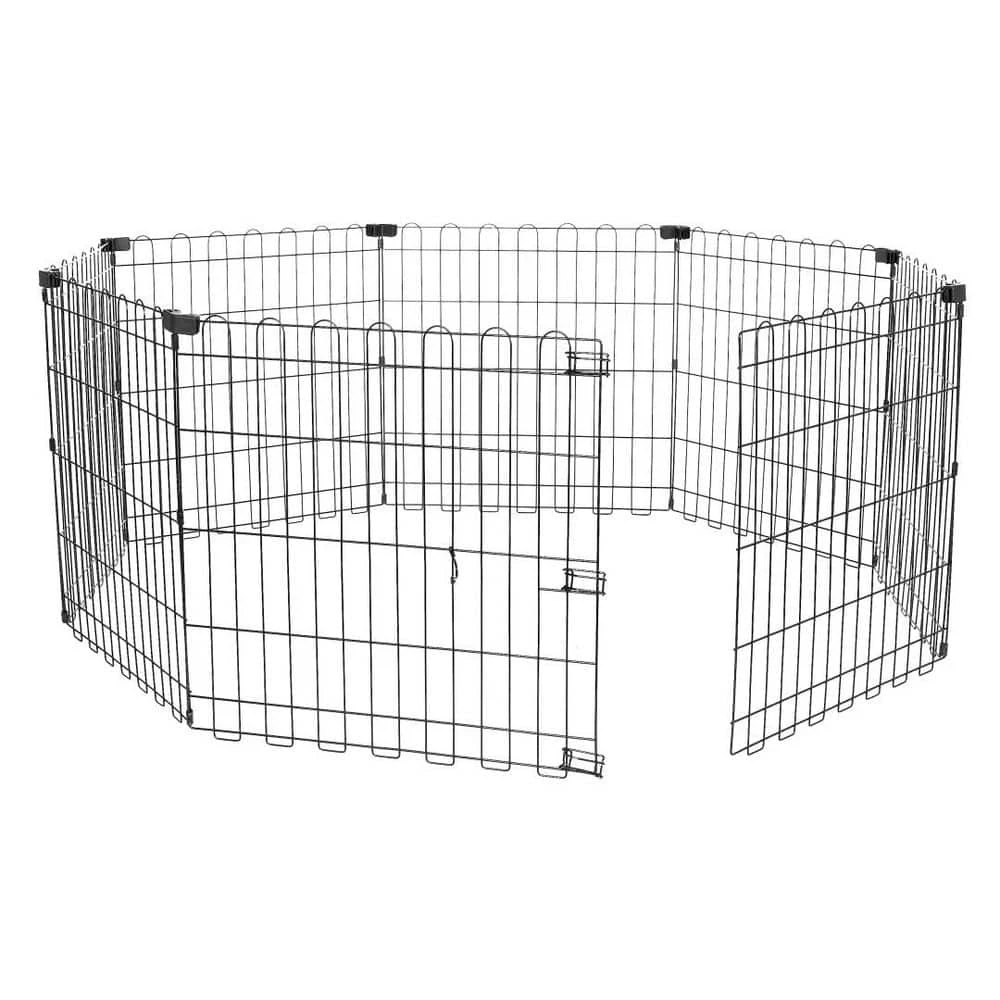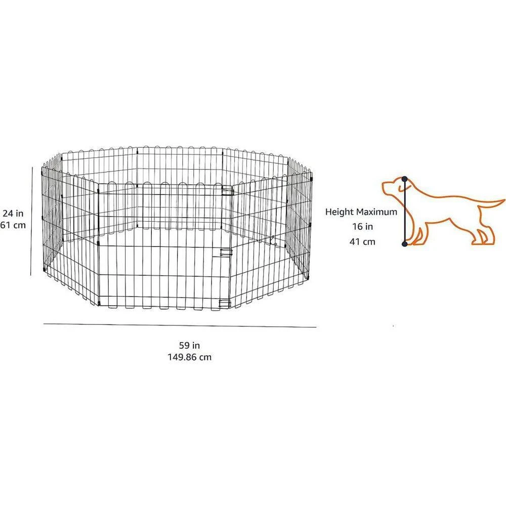 This 24-inch extra-small exercise playpen (without a door) is designed for dogs up to 16 inches tall or other small pets. Made of durable rust-proof iron wire, it includes 8 connectable panels with thumb clips for joining the ends together and 8 ground anchors for secure outdoor placement. The pen can be easily configured into multiple standalone shapes (round, square, rectangle) for playtime or to block off a room. It sets up in seconds; simply unfold, shape, and connect without the need for tools, and it folds flat for easy transportation and storage. Please note that pets should not be left unattended outdoors. Product dimensions include a round shape of 60x60x24 inches (LxWxH) or a square shape of 48x48x24 inches (LxWxH), with each panel measuring 24×24 inches (LxH).