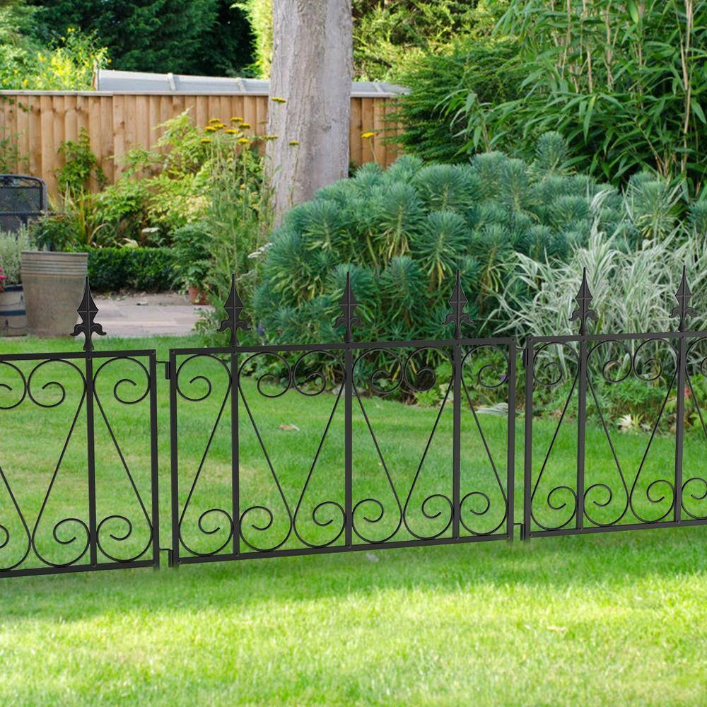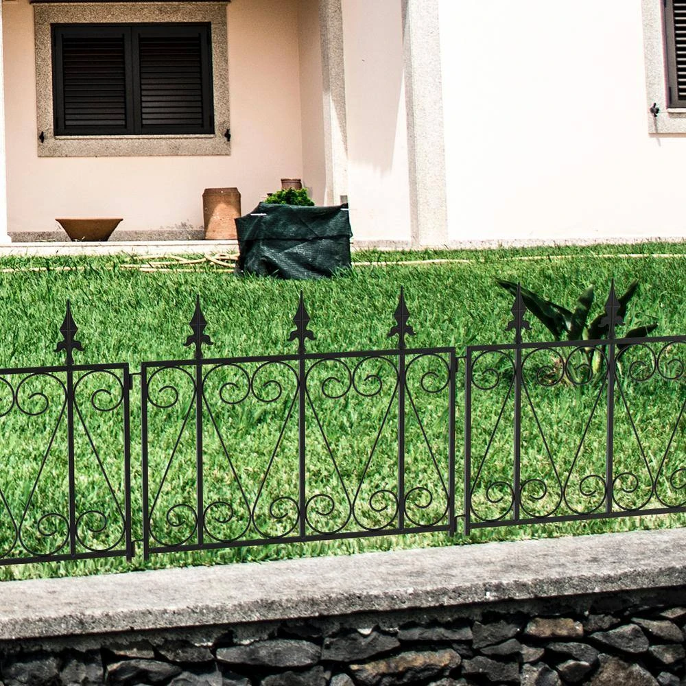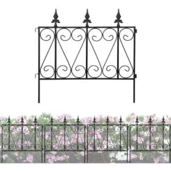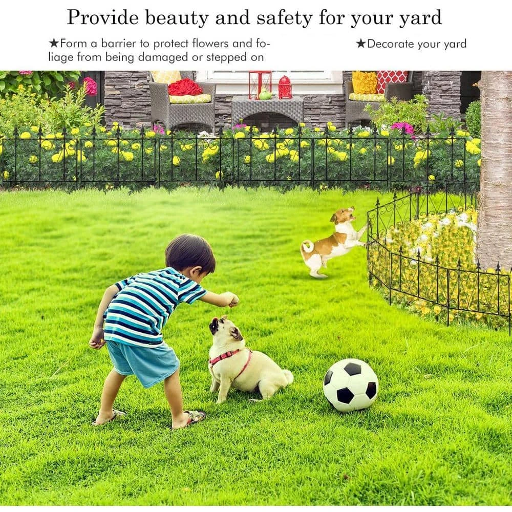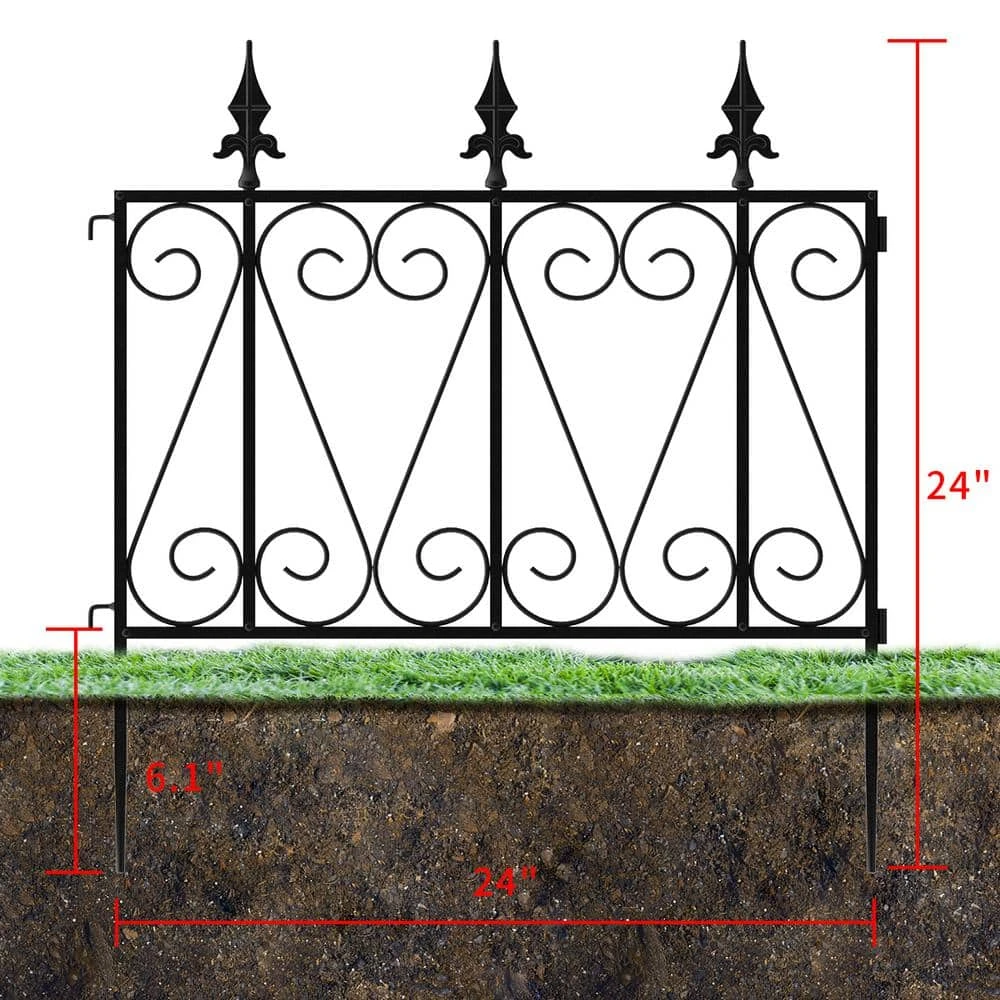 Decorative garden fence metal with single panel size 24 in. H x 24 in. W, 4-Panels in total. This metal decorative flower bed fencing panels for front yard is made of black iron with rustproof coated surface will enable you to use border fence outdoor durably. Each-Piece of temporary movable border fencing can be easily interlocked with the lock on the side and folds flat for easy storage; no additional tools required to install this patio landscape edging fence; simply stick and secure the pointed legs of this decor no dig fence sections into ground. It’s foldable and folds flat for easy storage. No additional tools to remove this temporary wire garden fencing for pets for reinstallation in another place. Simply pull the pointed legs of this flower garden border fencing out from the ground where you stick this vegetable garden fencing then reinstall A great option to make a landscape border and barrier for naughty dogs in your yard.