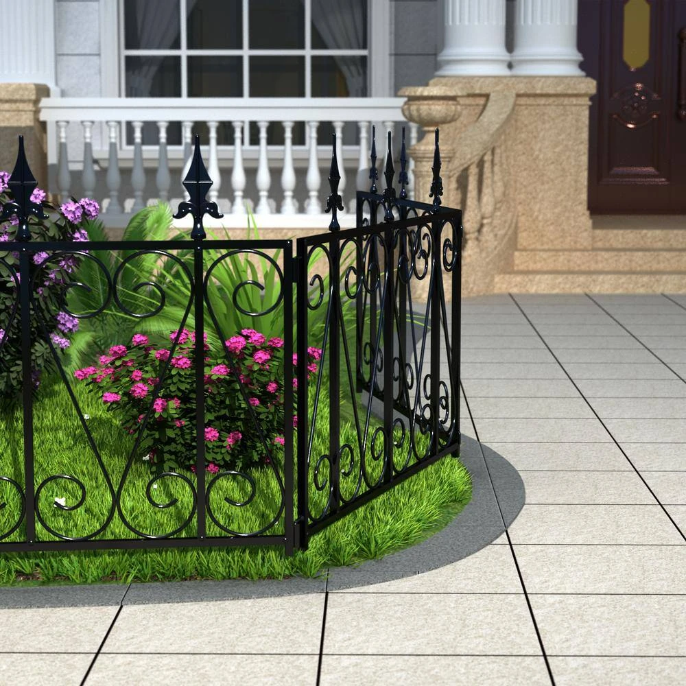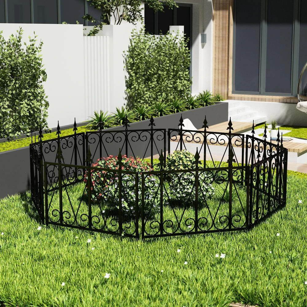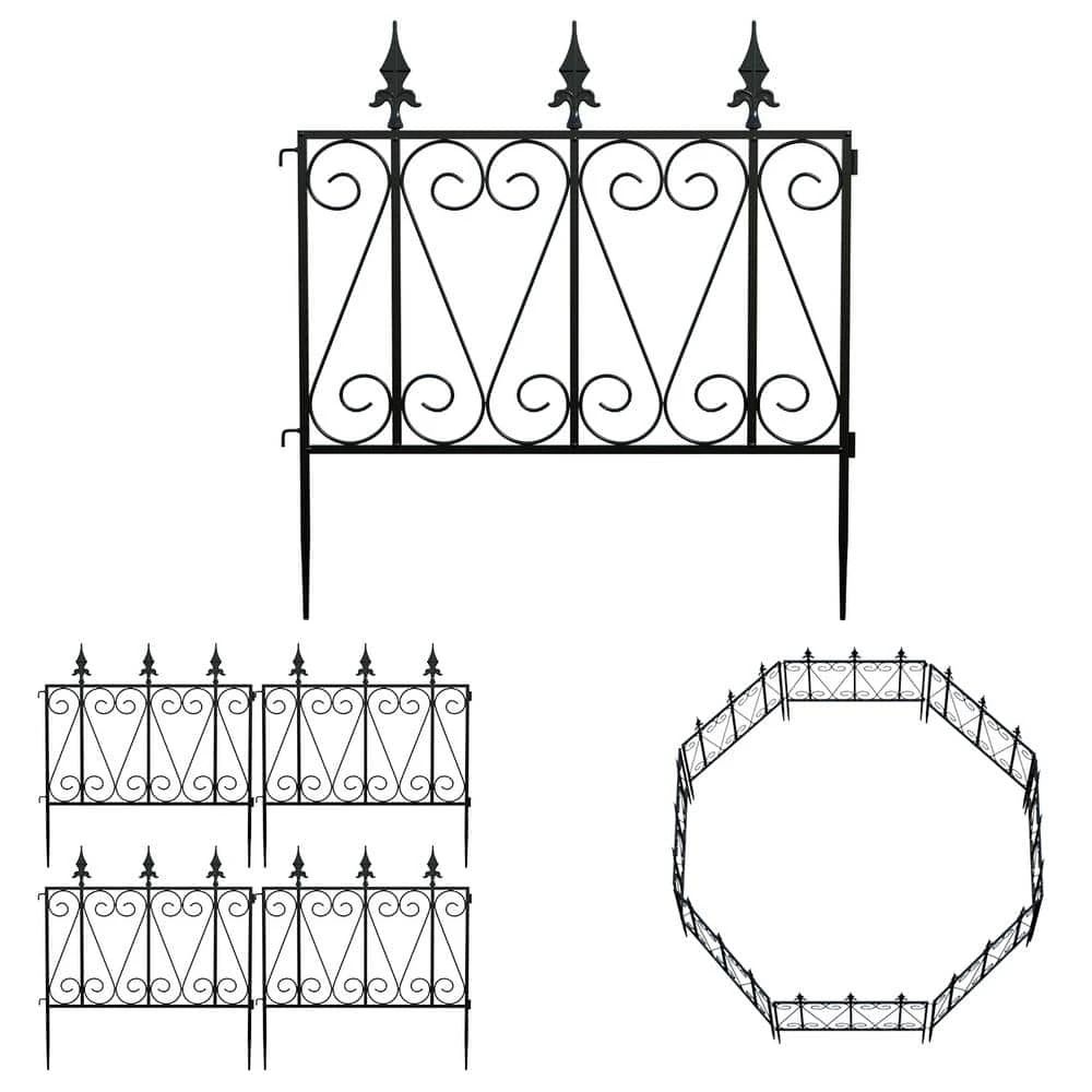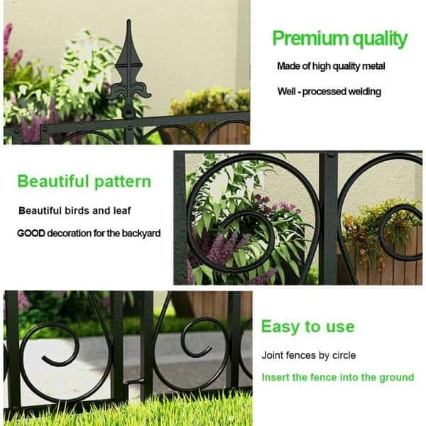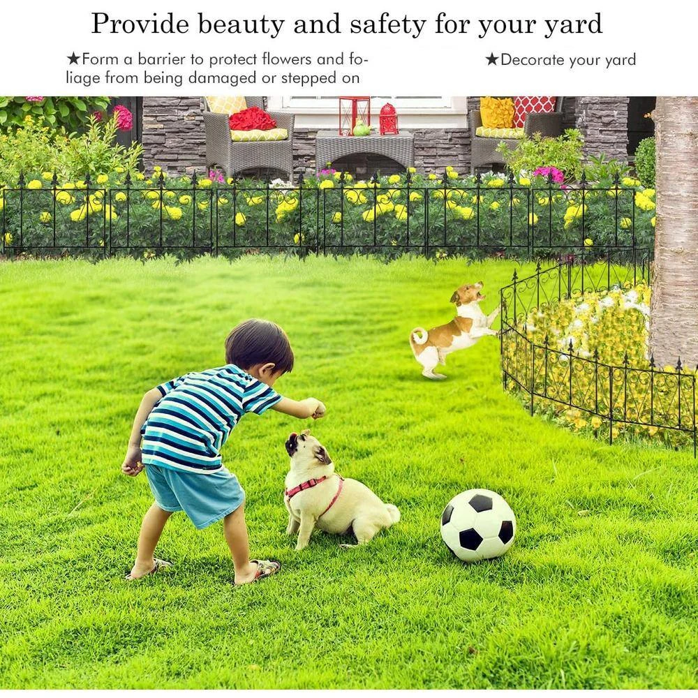 Decorative garden fence metal with single panel size 24 in. H x 24 in. W, 8-Panels in total. This metal decorative flower bed fencing panels for front yard is made of black iron with rustproof coated surface will enable you to use border fence outdoor durably. Each-Piece of temporary movable border fencing can be easily interlocked with the lock on the side and folds flat for easy storage, no additional tools required to install this patio landscape edging fence, simply stick and secure the pointed legs of this decor no dig fence sections into ground. It’s foldable and folds flat for easy storage. No additional tools to remove this temporary wire garden fencing for pets for reinstallation in another place. Simply pull the pointed legs of this flower garden border fencing out from the ground where you stick this vegetable garden fencing then reinstall A great option to make a landscape border and barrier for naughty dogs in your yard.