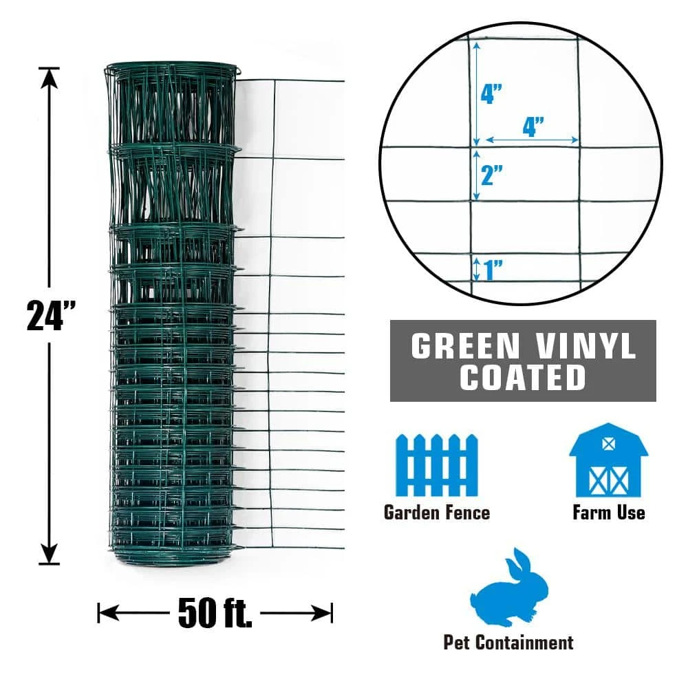 Fencer Wire 16 Gauge Green Vinyl Coated Rabbit Guard Fence, Poultry Fencing Wire Roll for Garden Yard Vegetable Plant, Protecting Against Rabbits and Other Small Animals Damage (24 in. x 50 ft.). Durable & Suitable. Multipurpose. Perfect Size. High Safety & The Right Protection.