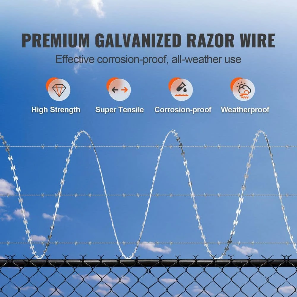 Ultimate Razor Wire Security Solution. Durable Protection with Extensive Coverage. Experience unparalleled security with SVOPES razor wire, crafted from high-strength hot-dip galvanized material for superior rust resistance. Spanning 246 ft., this fencing features sharp 0.02 in. blades and robust 0.16 in. thick core wires, delivering exceptional defense. Each package includes protective gloves for a safe installation process. Durable Hot-Dip Galvanization, Precision Sharp Blades, Sturdy Core Wire Construction, Extensive 246 ft. Length, Includes Safety Installation Gear.