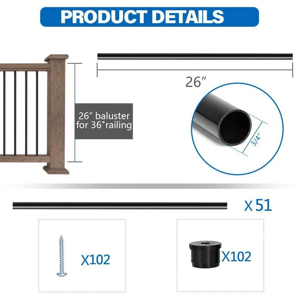 - Crafted from high-quality aluminum, these 26 in. deck balusters are rust-resistant and weatherproof, ensuring durability in various conditions, they boast a powder-coated finish that is eco-friendly, included in the package are 51 balusters, each 26 in. long and 3/4 in. in Dia along with 102 connectors and screws, ideal for creating a 36 in. rail height