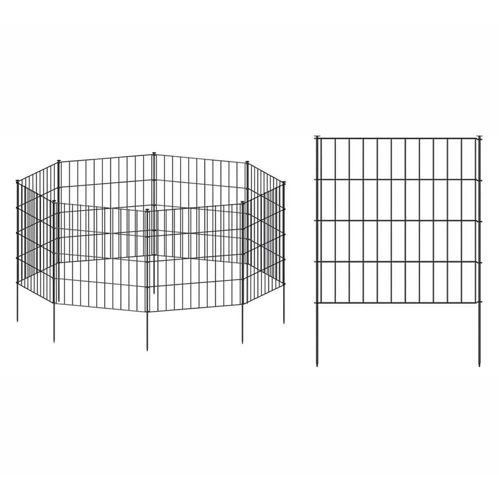 - Set includes 8 fence panels and 9 stakes, each panel measuring 28 in. high and wide, with stakes at 38.5 in. the total length covers 18.7 ft. in a sleek black finish