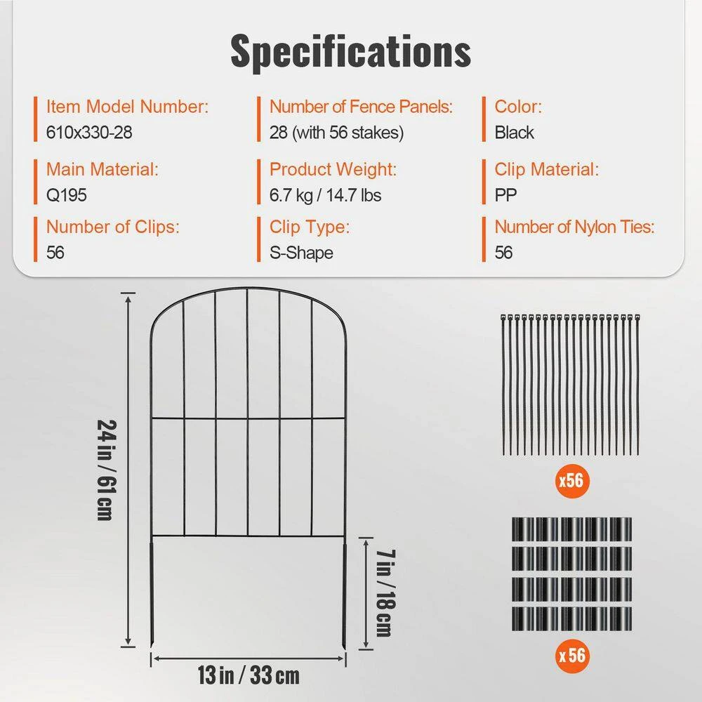 This garden fence combines practicality and elegance, featuring a 24 in. height and 2 in. spike spacing to deter pets and wildlife effectively. Its S-clip system ensures quick, tool-free installation, while the powder-coated carbon steel construction resists rust and weathering for long-term durability. Designed with sharp ground spikes and a triple-layer welded frame, it remains stable on uneven terrain. The sleek black finish discreetly integrates into any landscape, serving dual purposes as a protective barrier or decorative border. Lightweight yet sturdy, it adapts to various uses from securing vegetable patches to enclosing pets without overwhelming the garden s aesthetics. Low maintenance and cost-effective, it provides a reliable, budget-friendly solution for enhancing garden security and organization.