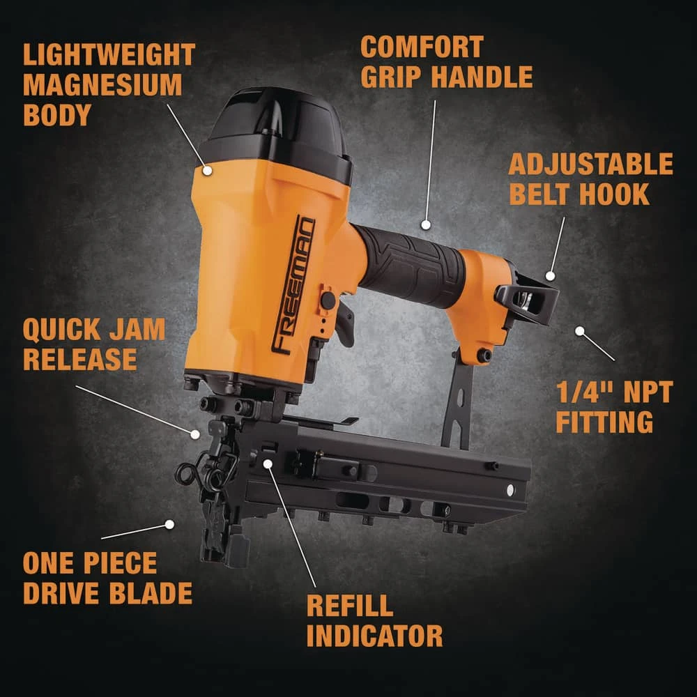 Freeman’s all-new 2nd Generation Pneumatic 10.5-Gauge Fencing Stapler has been completely redesigned with contractors’ needs in mind. Re-engineered internal components, top of the line features, and enhanced driving power make this fencing stapler more powerful and reliable than ever before. This durable air powered staple gun delivers high-quality performance for your next heavy duty mesh and woven projects, such as electrified single wire with insulation, hog and cattle fencing, pet enclosures, deer prevention, vineyard trellising, and snow control fencing. Optimized airflow and upgraded internal parts provide increased power with less air consumption, while also allowing for quick and easy repairs. Designed for maximum comfort and control, other features include easily adjustable depth of drive, quick jam release, an updated textured grip, and a wire alignment notch. The Freeman 2nd Generation Pneumatic 10.5-Gauge Fencing Stapler comes with an adjustable metal belt hook and 1/4 in. NPT air connector, and is backed by an industry-leading 7 Year Professional Warranty and 90 Day Wearable Parts Warranty.