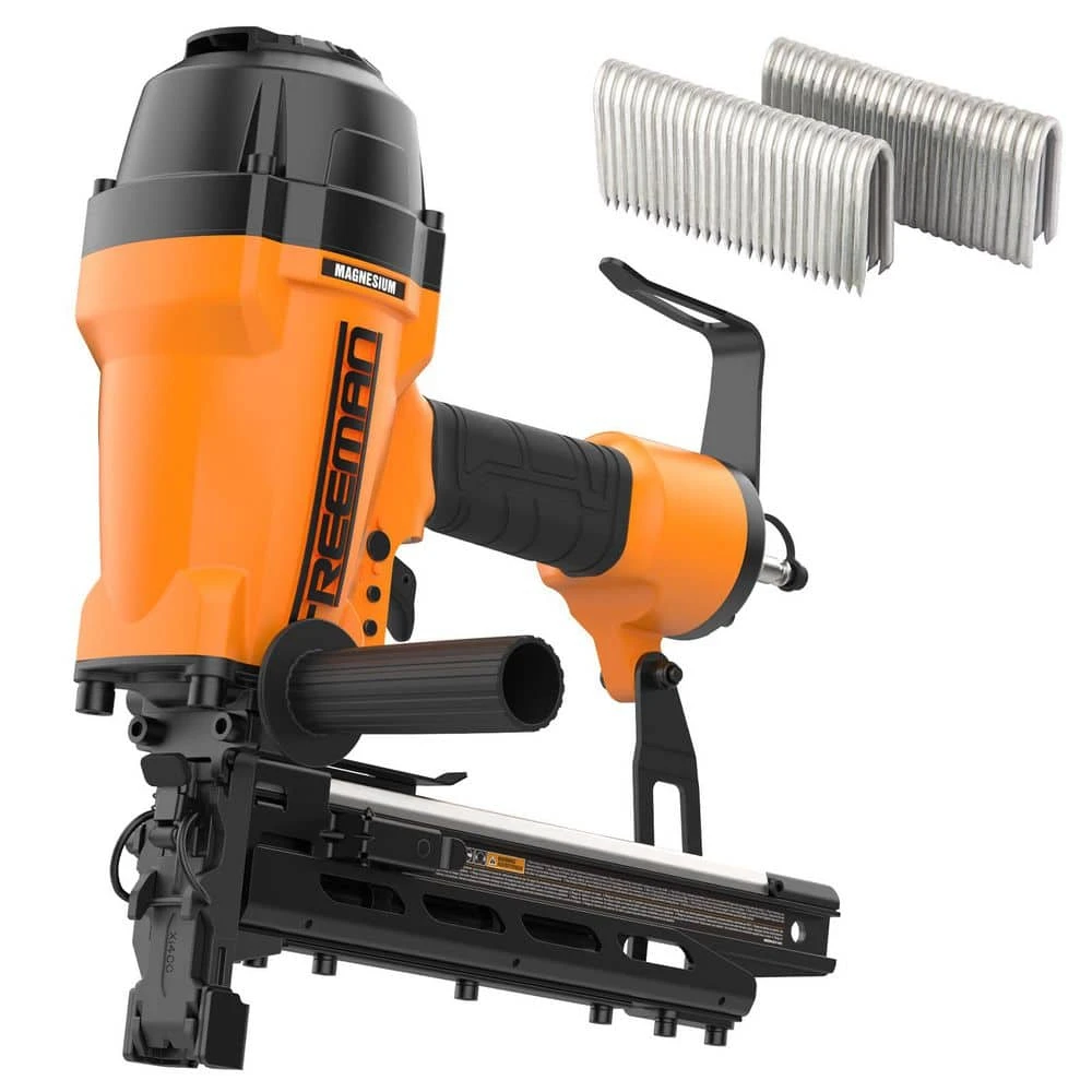 Freeman’s all-new 2nd Generation Pneumatic 9-Gauge Fencing Stapler has been completely redesigned with contractors’ needs in mind. Re-engineered internal components, top of the line features, and enhanced driving power make this fencing stapler more powerful and reliable than ever before. This durable air powered staple gun delivers high-quality performance for your next heavy duty mesh and woven projects, such as electrified single wire with insulation, horse and deer fencing, and chain link fencing. Optimized airflow and upgraded internal parts provide increased power with less air consumption, while also allowing for quick and easy repairs. Designed for maximum comfort and control, other features include easily adjustable depth of drive, quick jam release, an updated textured grip, and a wire alignment notch. The Freeman 2nd Generation Pneumatic 9-Gauge Fencing Stapler comes with a blow molded case, T-handle, adjustable metal belt hook and 1/4 in. NPT air connector, and is backed by an industry-leading 7 Year Professional Warranty and 90 Day Wearable Parts Warranty.