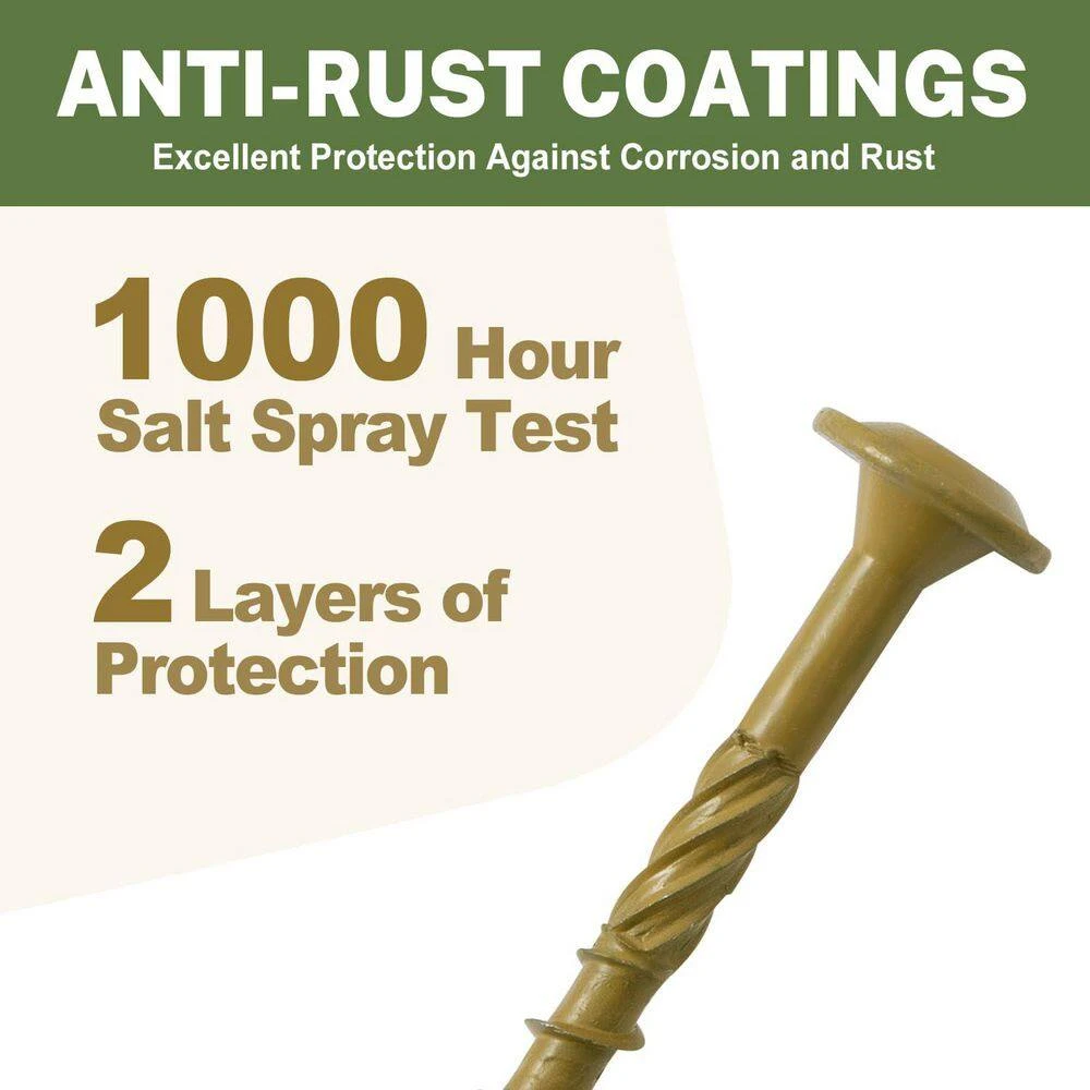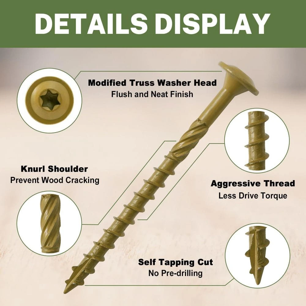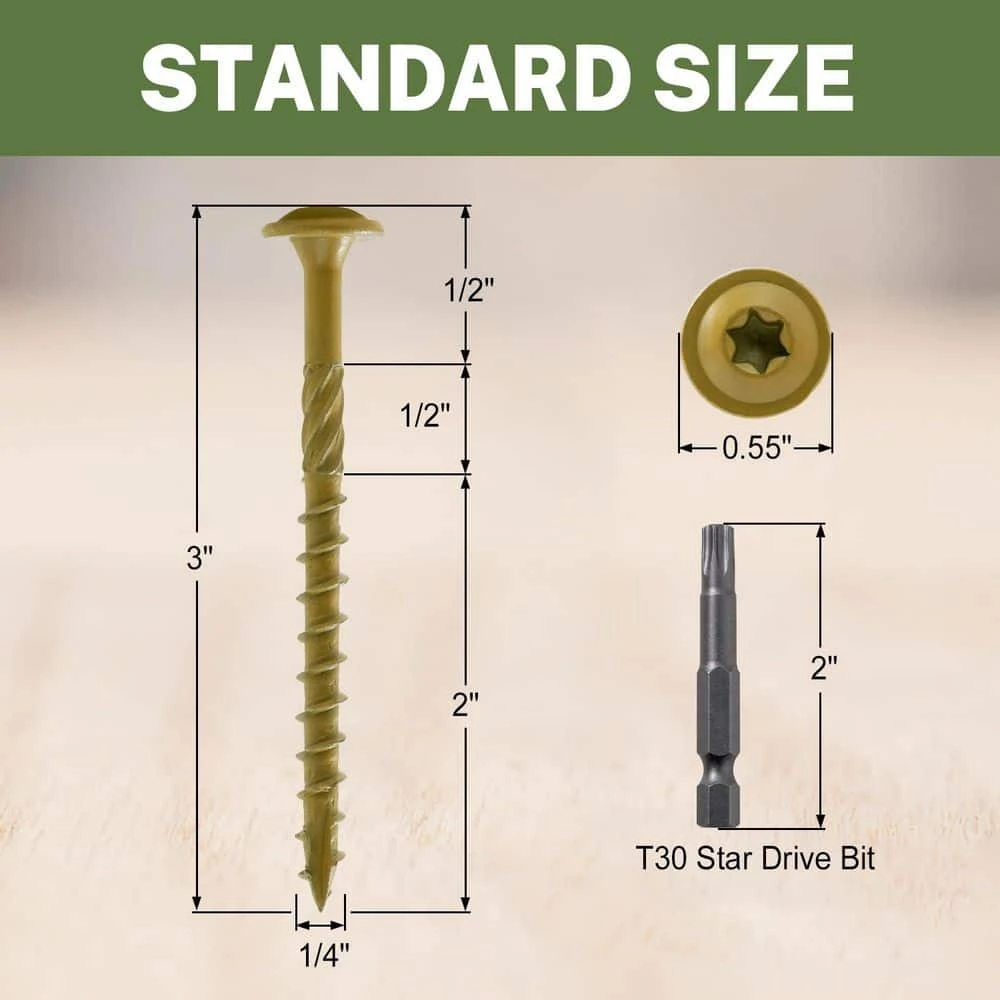 This lag screw is renowned for its exceptional strength, crafted from heat-treated steel and featuring a thread diameter of 0.25 inches, a head diameter of 0.55 inches, and a length of 3 inches, compatible with a T30 torx bit. The screw surface is coated with double layers of anticorrosive material and has passed the 1000-hour salt spray test, ensuring durability in harsh environments. Its knurled thread design reduces torque requirements, while the self-tapping, ultra-sharp point facilitates easy and damage-free drilling into wood. The modified truss washer head design offers a neat appearance, and the T30 torx drive ensures a safe and efficient fastening process, preventing slippage. This lag screw is suitable for outdoor, household, and industrial woodworking tasks, including deck building, log construction, timber framing, and more.