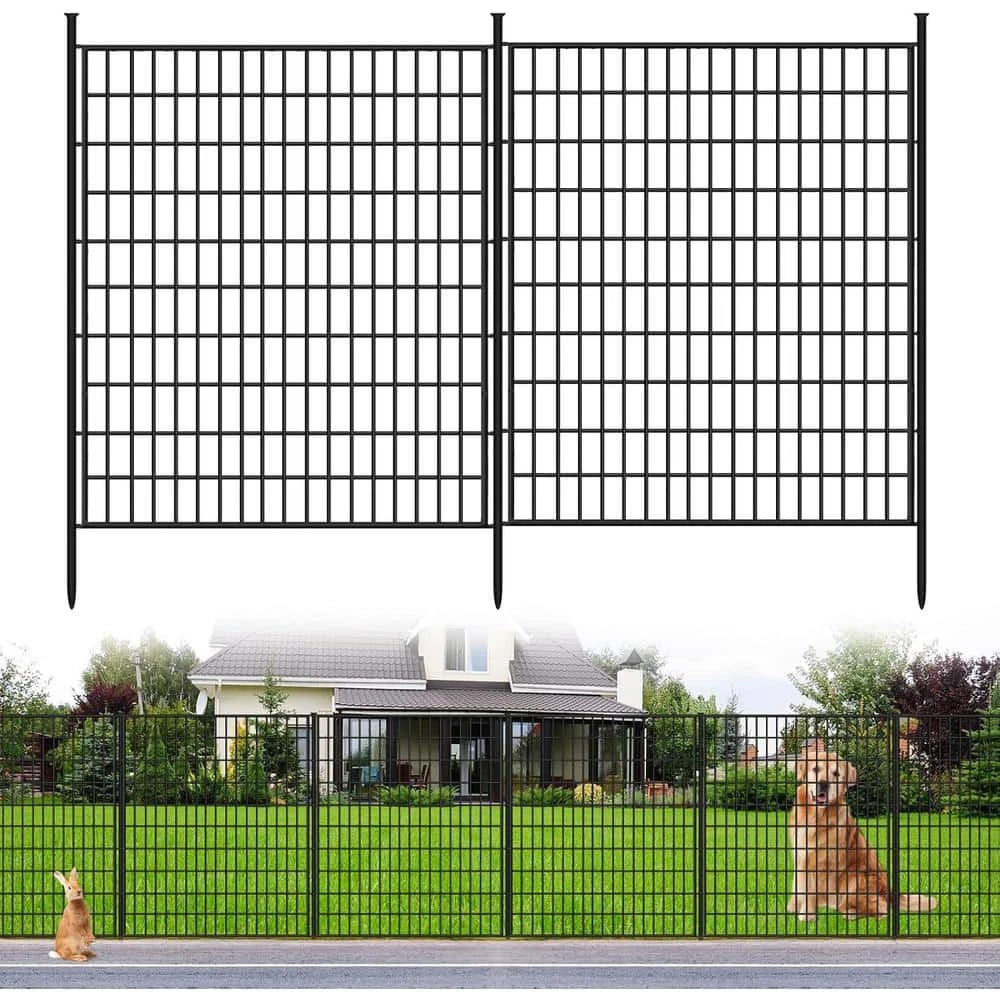 Protect your garden and define your space with this 33 in. metal garden fencing animal barrier. Each rustproof panel measures 33 in. High by 29 in. wide, providing a customizable layout across 24 ft. to keep large dogs and small critters out, thanks to the 1.4 in. gap spacing. With heavy-duty 8.3 in. ground stakes for stability and an elegant black finish, this durable no-dig fence is perfect for pet containment, plant protection, and adding a stylish touch to any yard or patio.