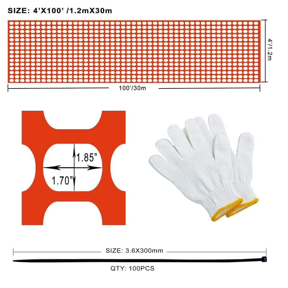 Safety Fence Plastic Mesh Fencing Roll, 4 ft. x 100 ft. (Orange) is a versatile, durable solution for temporary fencing needs, ideal for construction sites, gardens, winter snow control, and event management. This 10.71 lbs. roll, made from high-density polyethylene (HDPE), offers a 4 ft. height and 100 ft. length, providing ample coverage for various applications. The bright orange color ensures high visibility day and night, enhancing safety by reducing collision risks in low-light conditions, while the 1.5 in. x 1.5 in. mesh design balances visibility with barrier effectiveness, blocking small animals like rabbits. Built with UV-resistant treatment, the mesh withstands over 500 hours of sun exposure, resisting fading and cracking for 2–3 years outdoors. Its 150 lbs. tensile strength in both directions ensures durability against wind and impact, making it suitable for temporary snow fences to slow snowdrift on roads or driveways. The roll comes with 100 zip ties for quick, tool-free installation simply secure it to posts or frames, ideal for solo setup in gardens to protect plants or at events to guide crowds. After use, it rolls into a compact size for easy storage in dry, ventilated areas, avoiding sunlight to maintain longevity. While perfect for isolation and warning, the mesh is not load-bearing, so avoid climbing or hanging heavy objects. Its lightweight design and flexibility make it far more portable than metal fencing, reducing installation time and effort.