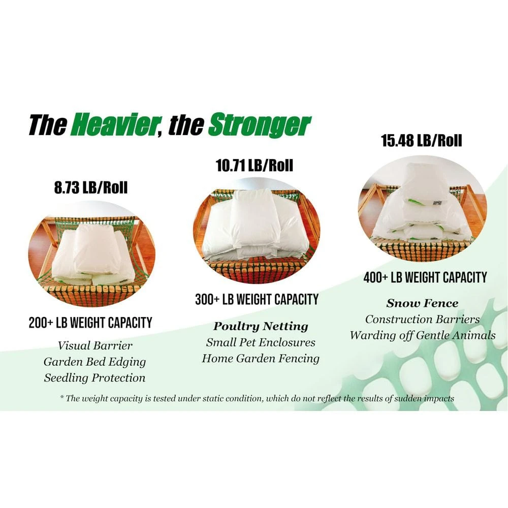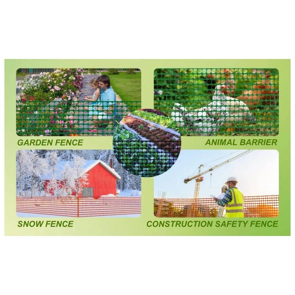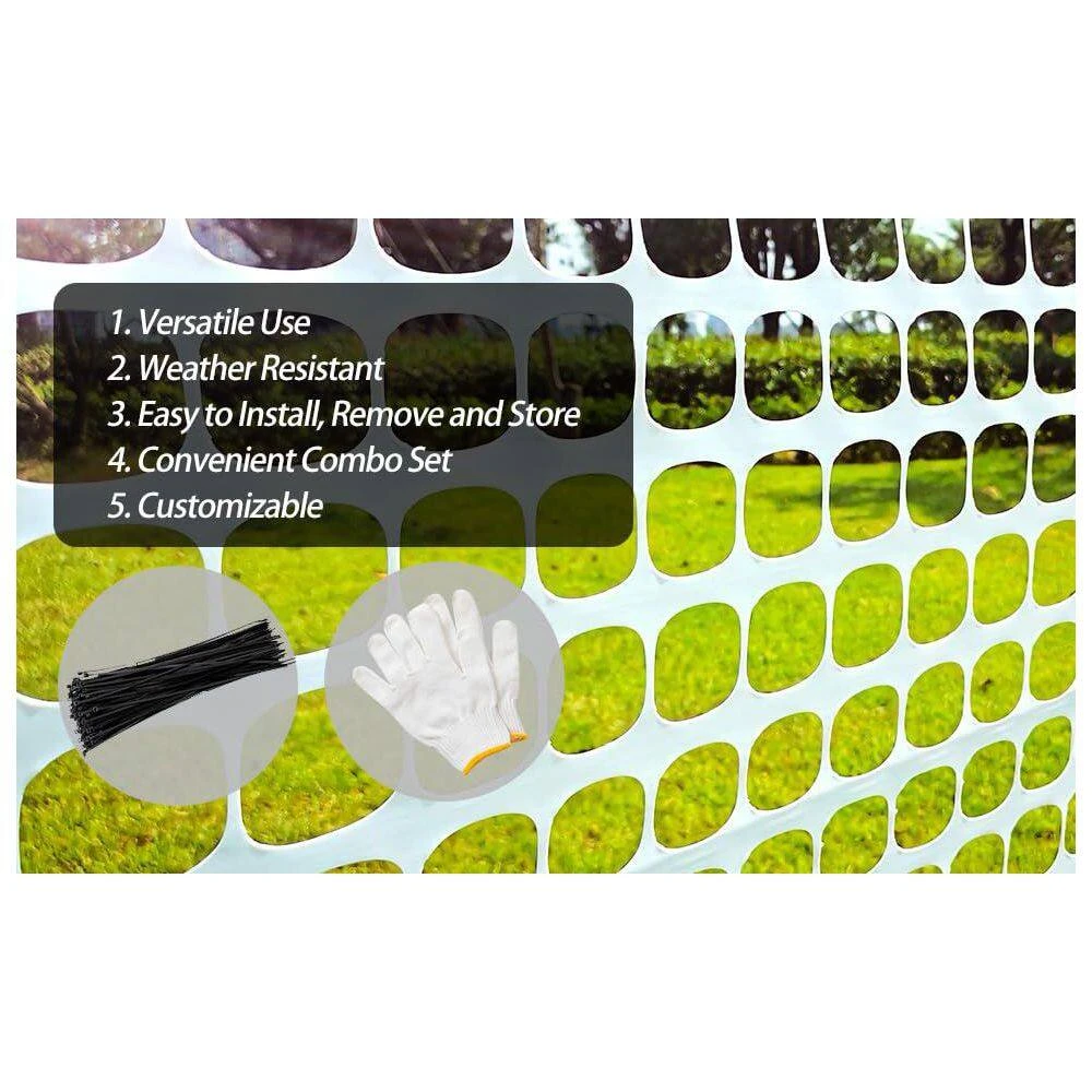 The plastic mesh fence is a versatile solution for a variety of outdoor temporary fencing needs, including garden fencing, animal barriers, poultry netting, construction safety, and pool fencing. Made of durable, UV-resistant plastic, it is reusable and environmentally friendly. Installation and disassembly are simple, allowing for easy nailing, binding, or wrapping around objects. The fence can be easily cut to size with smooth edges, providing flexibility for different applications. The product package includes a 4 ft. x 100 ft. mesh roll, 100 ties for secure fixation, and a pair of gloves for safe installation. Posts are not included. Should you have any questions or issues, our customer service team is ready to assist you.