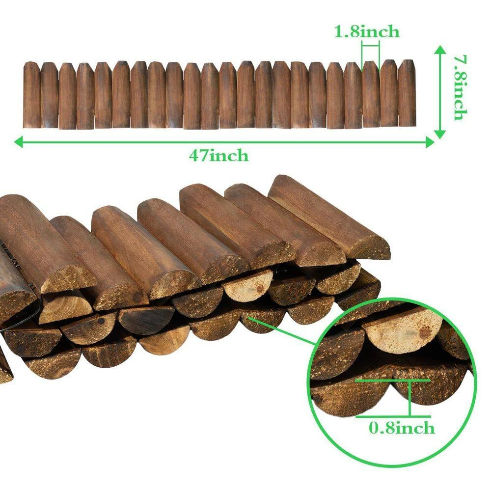 Enhance the beauty and organization of your garden with this durable wooden garden edging fence. Designed with a rustic style, it adds a natural charm to flower beds, pathways, and landscaping projects. The wood undergoes a carbonization process, ensuring durability without cracking, warping, or yellowing over time. Its metal inner core connection provides superior stability compared to traditional nailed designs. The fence is available in multiple quantities and sizes, allowing for customizable garden edging. Easy to install, it helps keep your garden neat and well-defined with minimal effort.