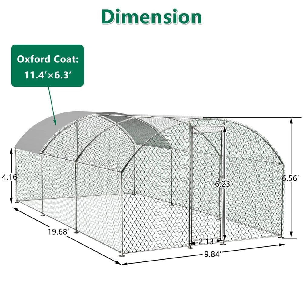 - Chicken coop info: overall dimensions: 9.84 ft. L x 19.68 ft. W x 6.56 in. H, the diameter of galvanized steel pipe: 1 in. tube diameter, assembly required
