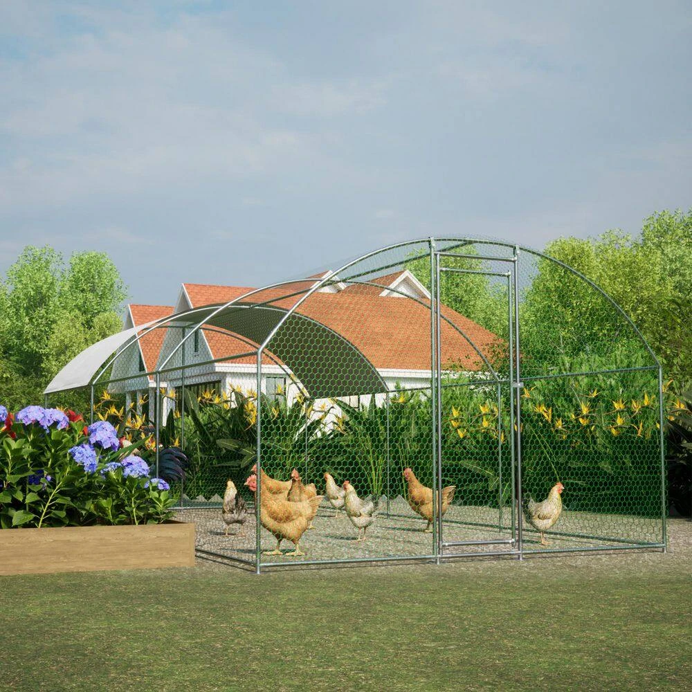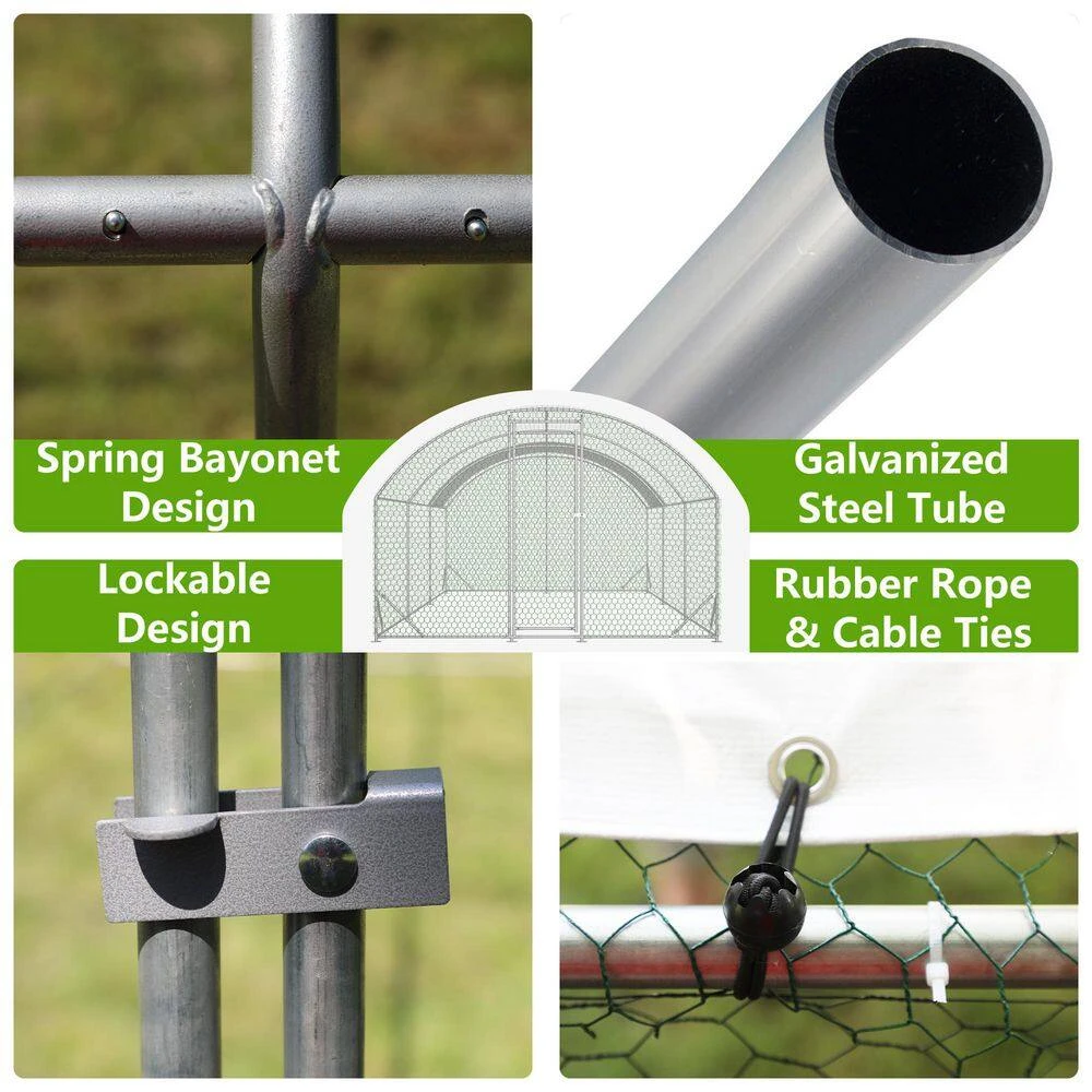Our chicken run manufactured with high quality steel frame, including ground nails, so that the fence can better fixed to the ground. Solid enough to keep the poultry from escaping and secure from predators. And this hen run house is also stably stationed to withstand the wind and snow weather. Featuring a durable sun and rain-proof tarp on the top, it is protective for the steel frame, wire mesh and animals under its cover. And the tarp is sturdy enough to avoid tear up or fade over time. Lockable chicken run house suitable for a variety of animals like for chickens, rabbits, ducks and more. This walk-in metal poultry house has a spacious area for the animal to play and rest in the backyard garden and farm settings.