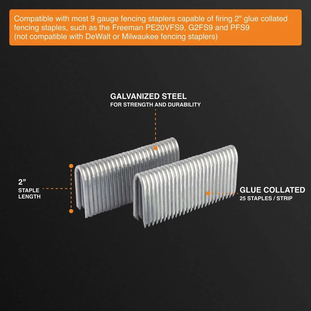 - Compatible with most 9-Gauge fencing staplers capable of firing 2 in. paper collated fencing staples, such as the Freeman PE20VFS9, G2FS9 and PFS9, Estwing EFS9, Stockade ST-400, Powermate FS2P, and Iron Horse IH-FS-1 (not compatible with DeWalt or Milwaukee fencing staplers)