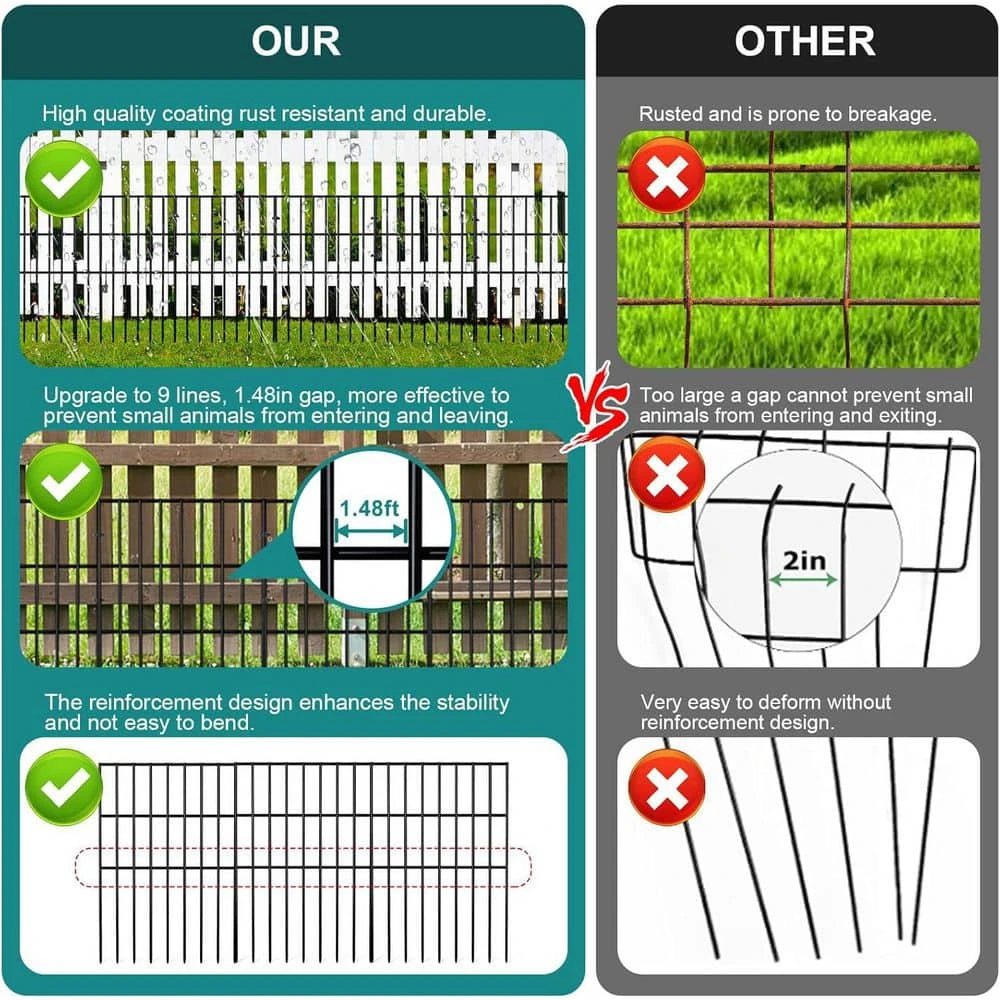 - The upgraded animal barrier features a reduced gap of 1.48 inches with 9 metal wires, offering enhanced protection against small animals like dogs and rabbits, perfect for gardens, yards, or patios. Constructed with thick metal wire, this durable, rustproof fence resists bending and harsh weather. High-quality baking paint ensures longevity, making it ideal for outdoor use in all conditions.