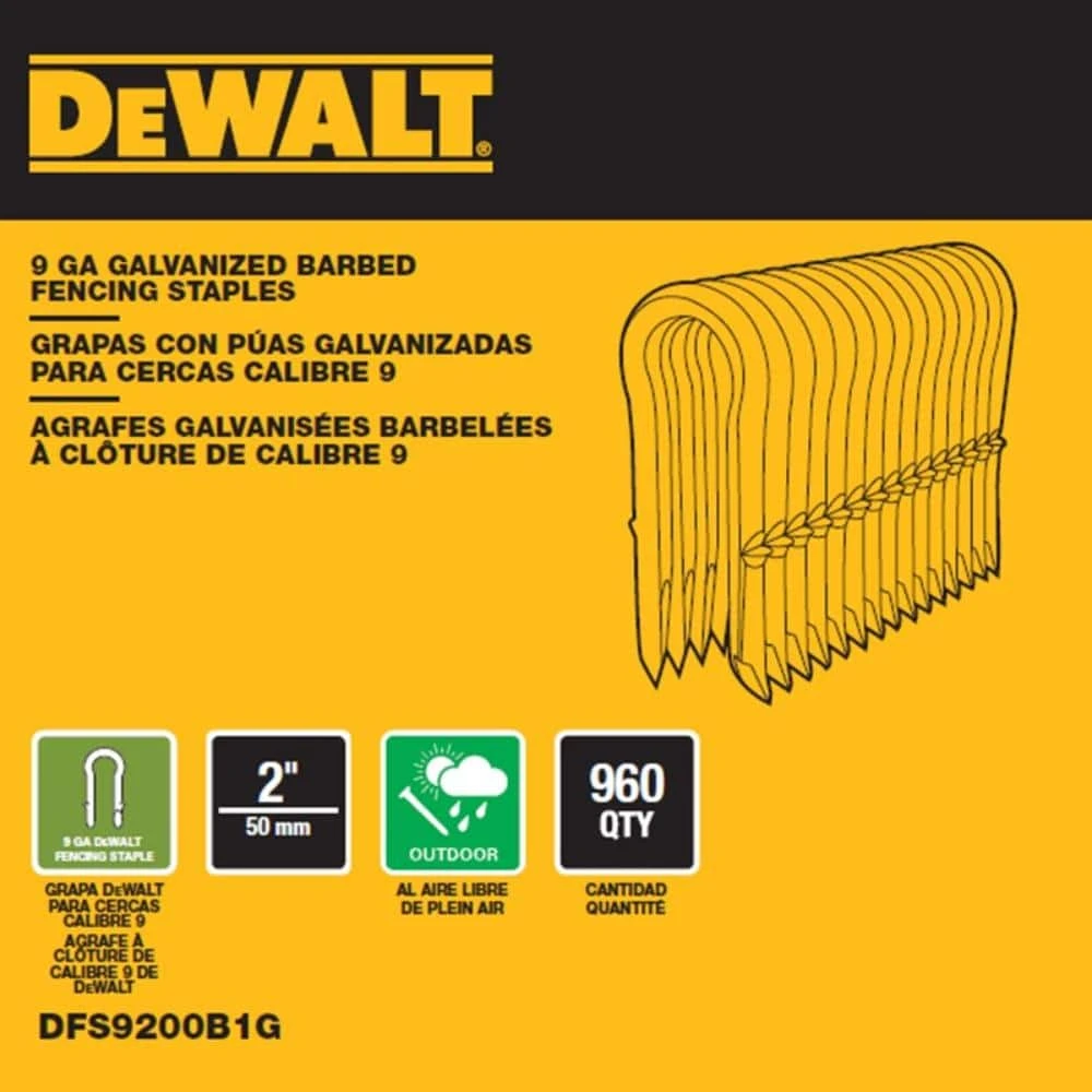 The DEWALT 9 GA Fencing Staples are designed for use with the DCFS950 cordless fencing stapler. Featuring divergent point tips, single barb legs paired with an adhesive coating, a galvanized zinc-aluminum coating and are available in 3 common sizes of 1-1/2 in., 1-3/4 in. and 2 in. to handle a wide variety of rural applications. With these staples you can get the job done quickly and be confident they will stand tough against the elements long after the job is done.