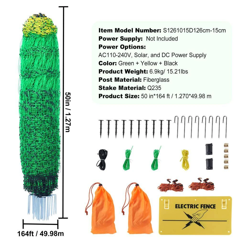 - Specifications: product size: 1.27 x 49.98 m 50 in. x 164 ft. product weight: 6.9 kg 15.21 lbs. power supply: not included power options: AC 110-240 V, solar, DC power supply, post material: fiberglass, stake material: Q235, color: green plus yellow plus black, item model number: S1261015D 126 cm-15 cm