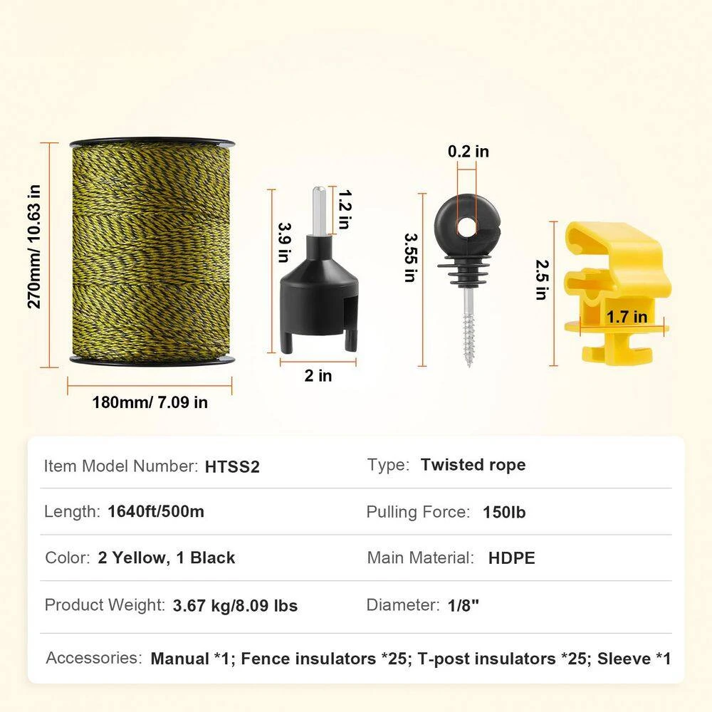 - Simple setup: the 1640 ft./500 m fencing wire comes with 50 insulators (25 screw-in and 25 T-post) and 1 sleeve, installation is a breeze using a drill (not included), and the ABS plastic reel helps with easy winding and storage