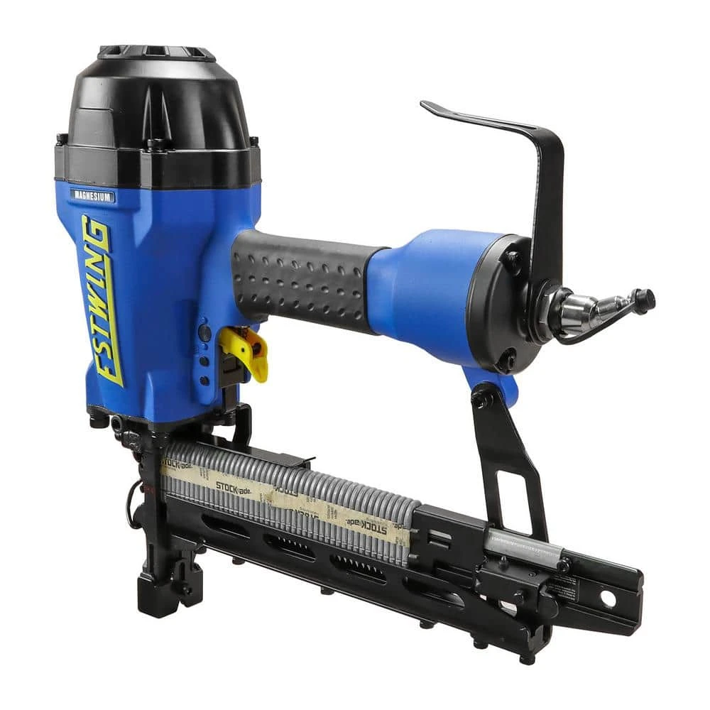 The Estwing EFS9 Pneumatic 9-Gauge 2 in. Fencing Stapler with Adjustable Metal Belt Hook, 1/4 in. NPT Industrial Swivel Fitting and Bag is ideal for working on heavy-duty mesh and woven projects such as such as electrified single wire with insulation, horse and deer fencing and chain link fencing. This air powered fencing stapler is both durable and lightweight, resulting in a rugged tool perfect for extended use. Built to last and designed for superior performance, the stapler features an anti-dry-firing design, depth adjust, quick jam release, a comfort grip handle and a wire alignment notch. Suitable for any professional construction contractor at the jobsite or DIYer at home, this fencing stapler includes a heavy-duty zippered canvas bag with detachable shoulder strap, T-handle, adjustable metal belt hook and 1/4 in. NPT swivel plug. The Pneumatic 9-Gauge 2 in. Fencing Stapler is part of Estwing’s professional line of pneumatic tools and is covered by a 5-Year Professional Tool Warranty and 90-Day Wearable Parts Warranty.