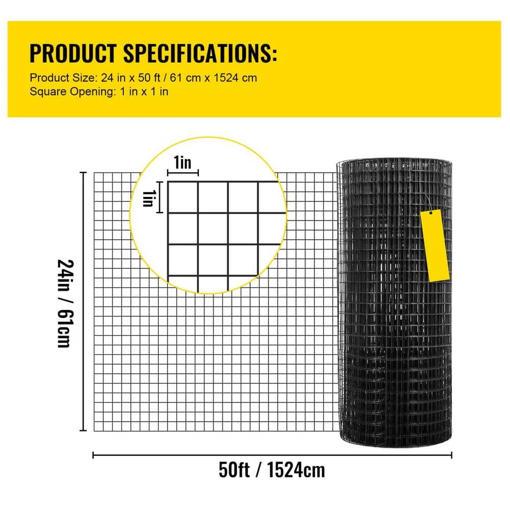 24 in. x 50 ft. Welded Wire Fence. 16 Gauge and 1 in. Mesh with Corrosion Resistance. Discover the ultimate solution for your fencing needs with our premium welded wire fence. Crafted from durable galvanized steel and coated with black vinyl, this product is designed to resist rust and corrosion, ensuring longevity and reliability. The robust welding technique provides a resilient structure that can withstand various environmental conditions. Installation is straightforward and can be enhanced with additional accessories, making it an ideal choice for diverse applications such as gardening and pet enclosures. Vinyl-Coated Galvanized Steel, 1 in. Square Mesh, Sturdy Welding Construction, User-Friendly Installation.