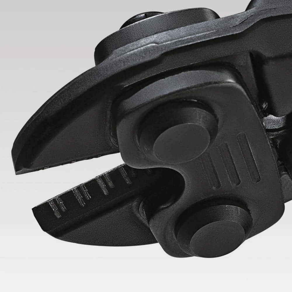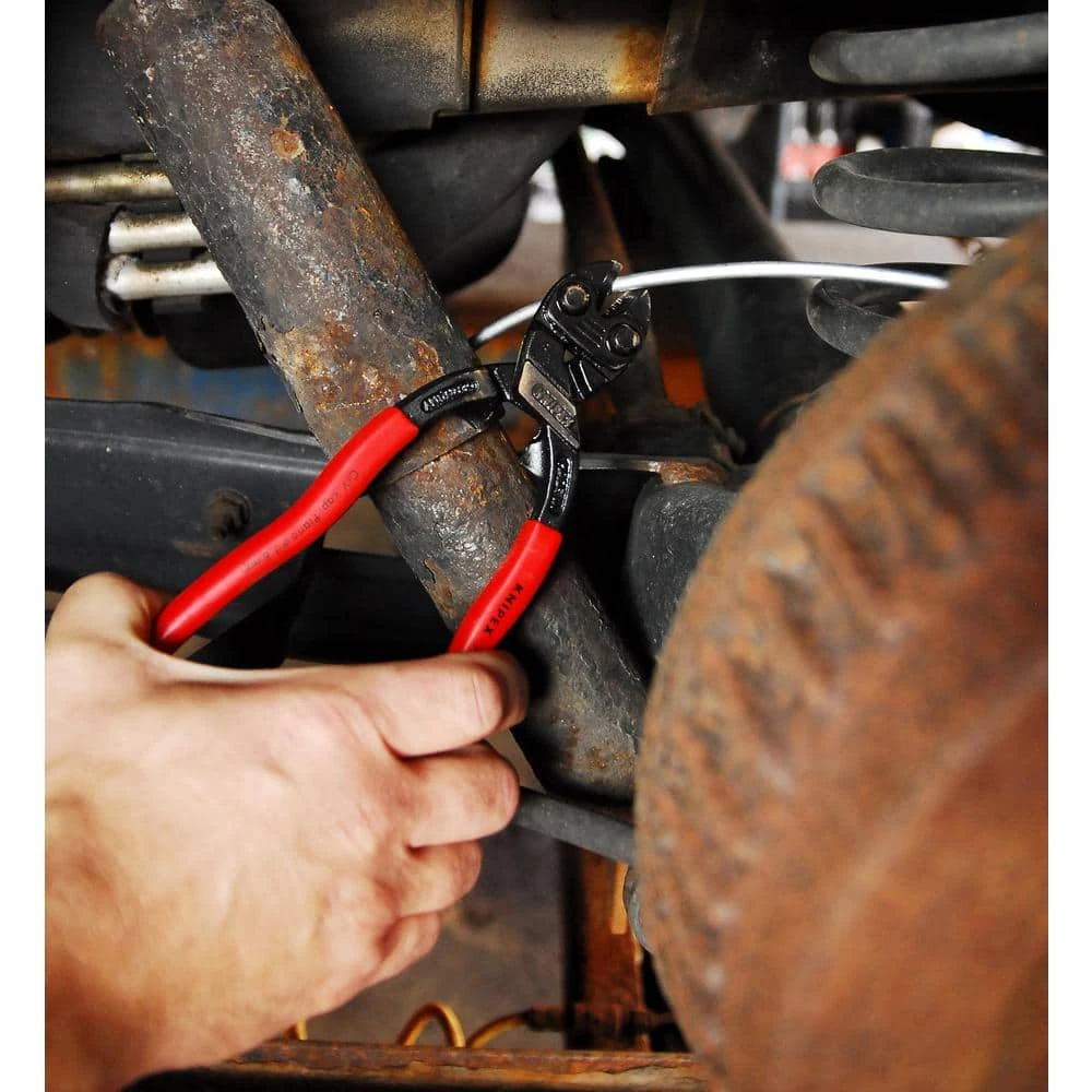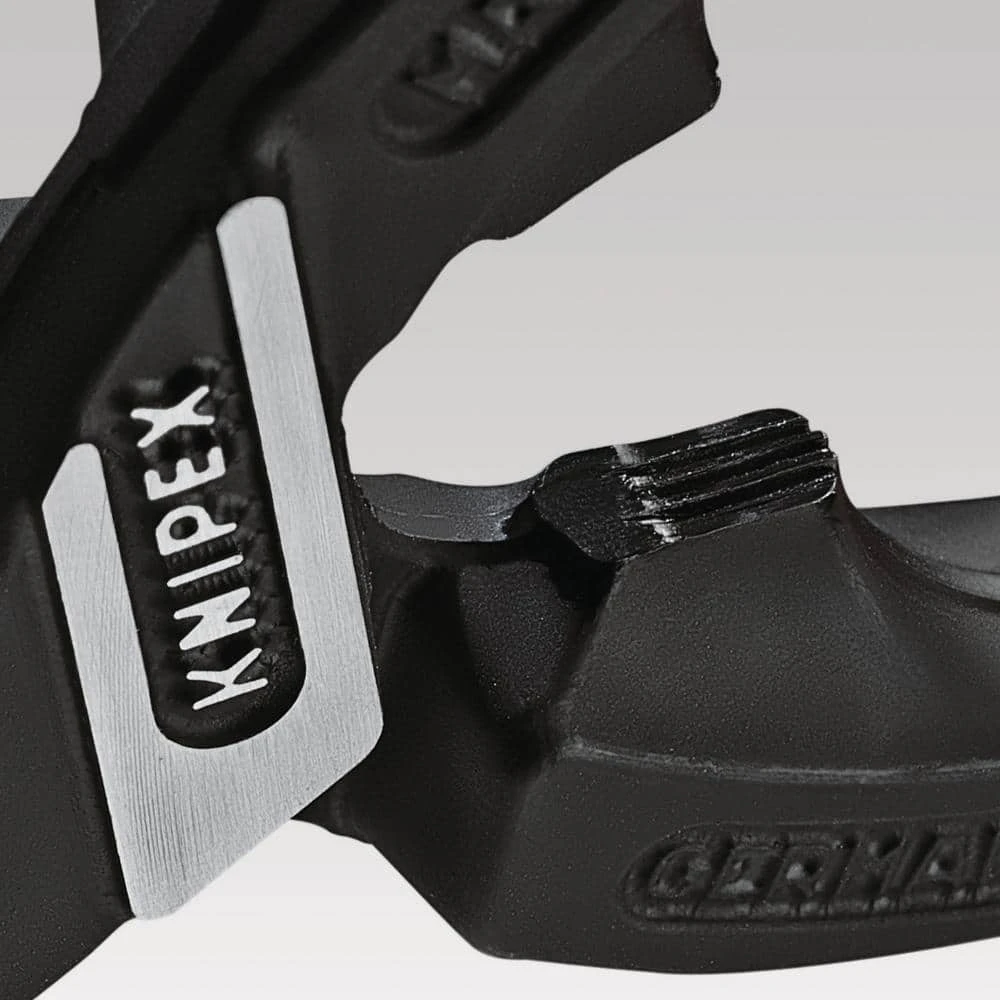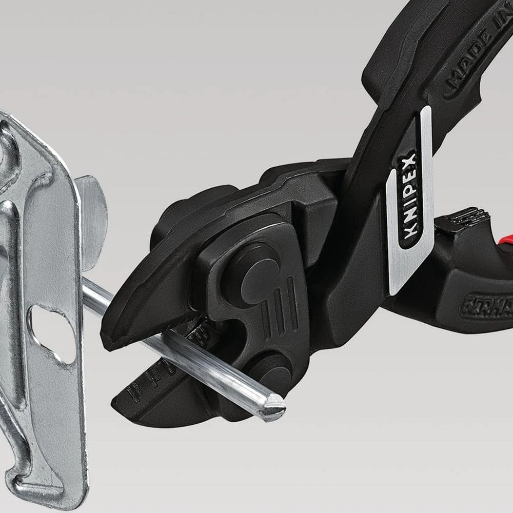 The KNIPEX High Leverage CoBolt Fencing Pliers are designed with reduced cutting-edge hardness to allow more pressure on the sides of the cutting edges (e.g. for making fences). The precision cutting edges will cut soft and hard wire. Cutting capacity: maximum 4 mm for hard wire. Cuts material like bolts, nails, rivets, etc. up to 5.2 mm Dia. Exceptional cutting performance with minimum effort because of new lever action design providing a 20:1 ratio. Cutting edges are induction hardened, cutting edge hardness approximately 62 HRC. Made of chrome vanadium heavy-duty steel forged, oil-hardened.