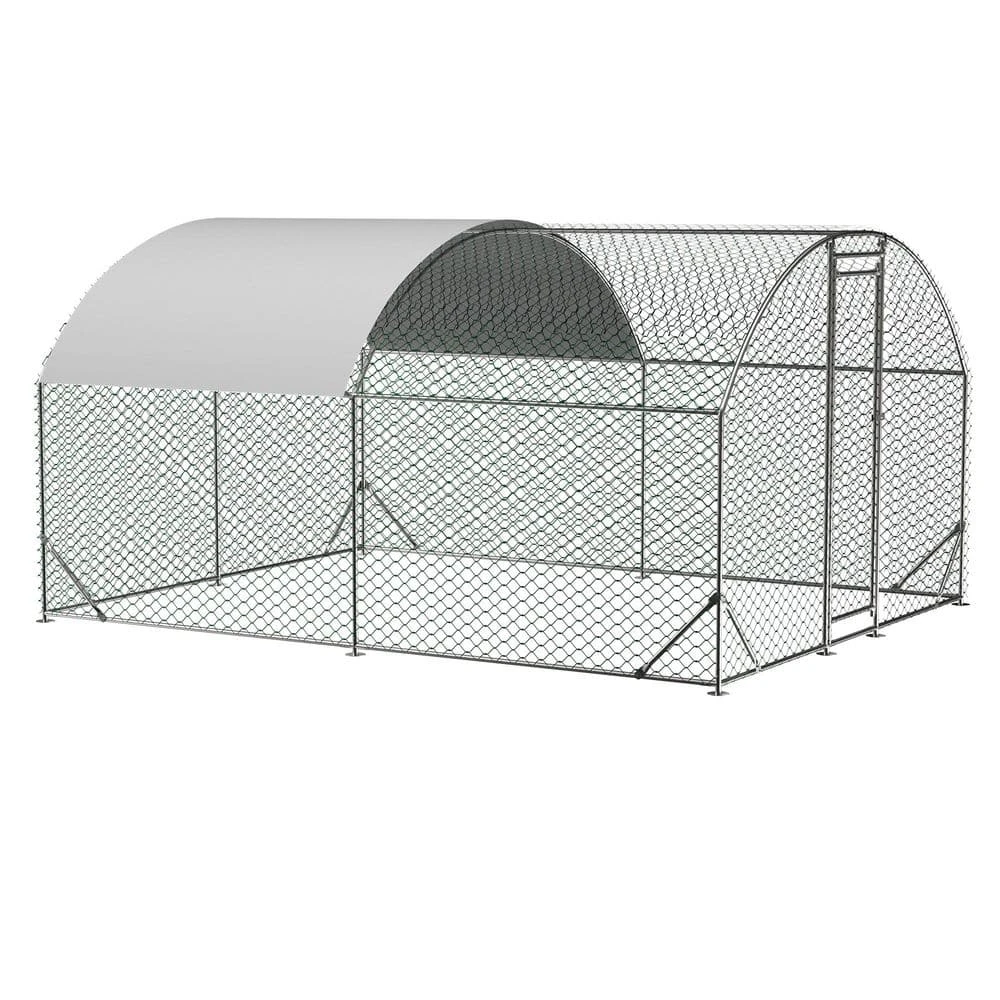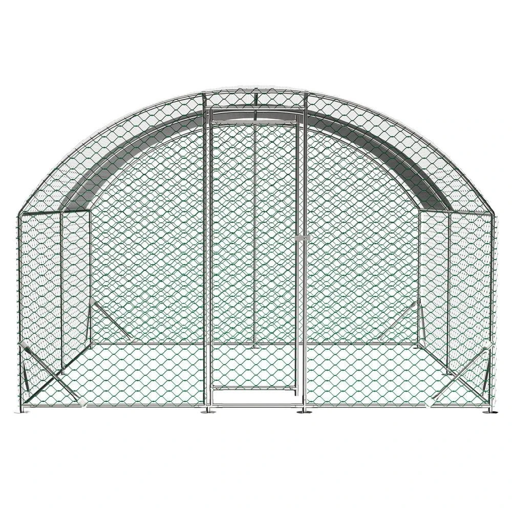 Our chicken coops are made of high-quality steel frame structure and equipped with ground nail design to ensure that the fence is firmly fixed to the ground. The overall structure is sturdy and durable, which can effectively prevent poultry from escaping and resist the invasion of predators. After professional reinforcement design, the chicken coop can withstand severe weather such as wind and snow, providing long-term and reliable protection for your poultry. The top is covered with a durable sun-proof and rain-proof tarpaulin, which can effectively protect the steel frame, wire mesh and the animals inside from the sun and rain. The tarpaulin is made of high-strength material, tear-resistant and non-fading, and it remains in good condition after long-term use. The fence is made of hexagonal wire mesh with fine mesh, which further prevents predators from entering and ensures the safety of the chickens. This large metal chicken coop uses a spring buckle design, which does not require welding and can be assembled quickly, saving time and effort. We provide a full set of components and simple installation instructions to make it easy for you to complete the construction.