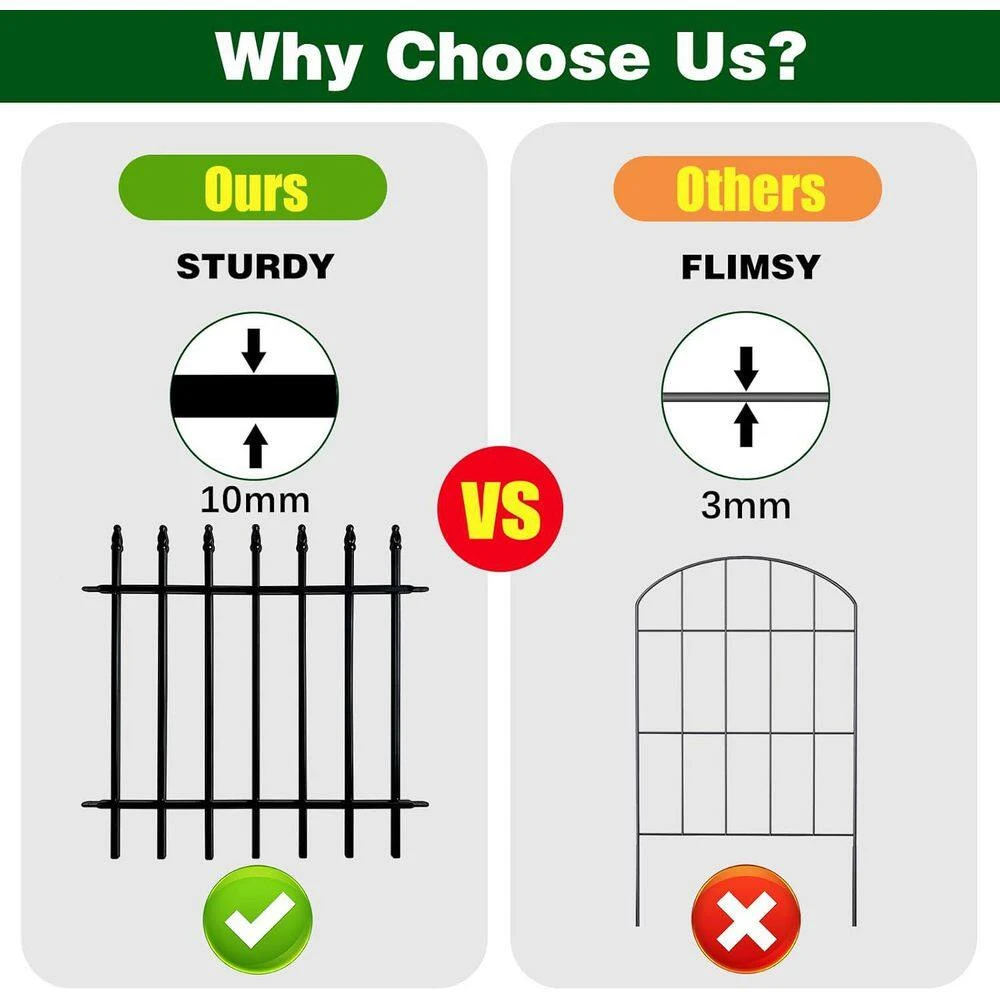 - Made from high-quality metal with a durable powder-coated finish, this wrought iron fence is rust and corrosion resistant, ensuring it stands up to weather conditions for years of reliable outdoor use