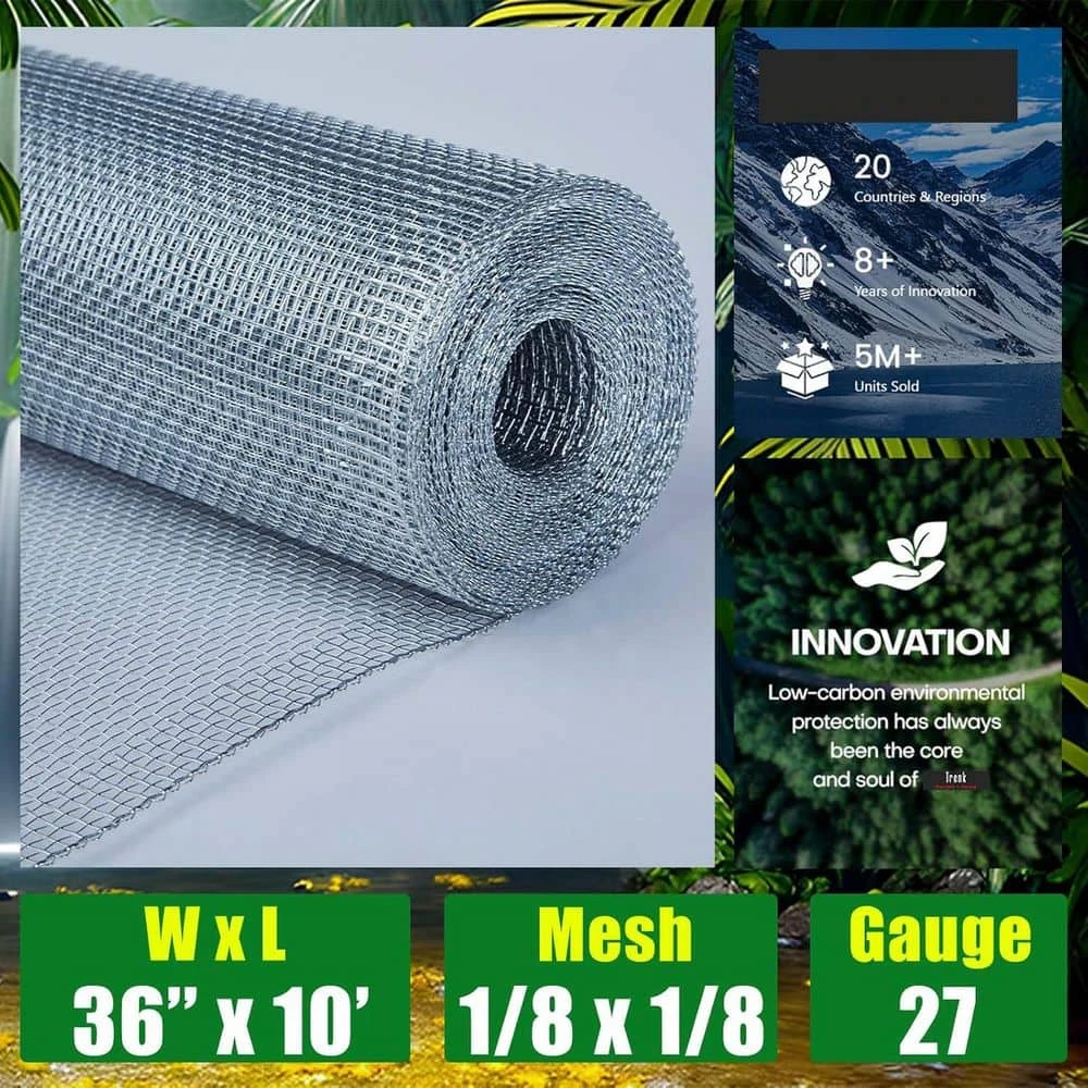 - Discover the versatility of a 36-inch by 10-foot roll with 1/8-inch mesh, crafted from durable 27-gauge Q195 low-carbon steel wire, rust-resistant and perfect for indoor or outdoor projects. This multi-functional mesh is ideal for security, construction, gardens, vent covers, and more, catering to DIY enthusiasts and professionals alike for a wide range of uses.