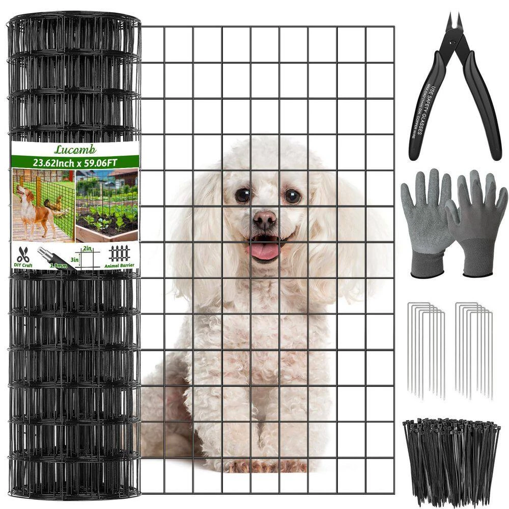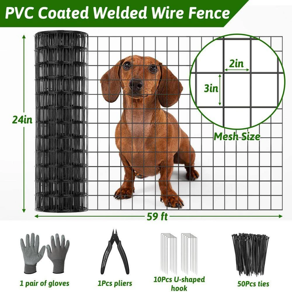 Protect your garden and outdoor spaces with this 24 in. x 59 ft. welded wire fence, expertly crafted from heavy-duty galvanized wire and coated with black PVC for enhanced rust resistance and durability. Whether you’re securing your yard from deer, dogs, or other small animals or embarking on creative DIY projects like plant climbing frames and vegetable enclosures, this versatile fence offers the perfect balance of strength and flexibility with its optimal 2 x 3 in. mesh size and 14-Gauge wire. Complete with a comprehensive installation kit including ties, U-shape hooks, gloves, and pliers, you can set up your protective barrier quickly and efficiently-ensuring peace of mind and security for your garden.