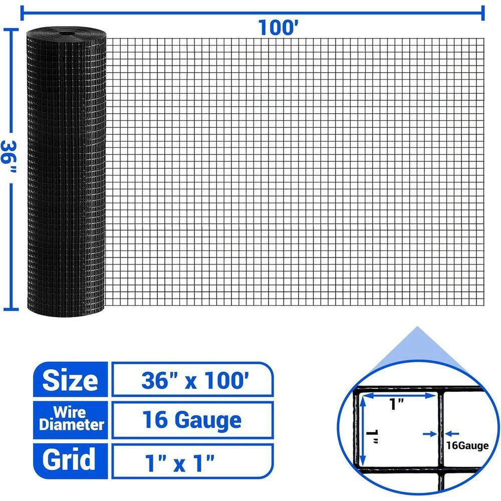 - This wire mesh roll features a 16-gauge steel construction with a 1 x 1 square hole grid, standing 36 inches tall and extending 100 feet long for extensive coverage in any project you undertake. Made from 16-gauge galvanized steel, this material is firm, uniform, and sturdy, with a powder-coated surface to prevent rust, corrosion and extend its service life while maintaining beauty.