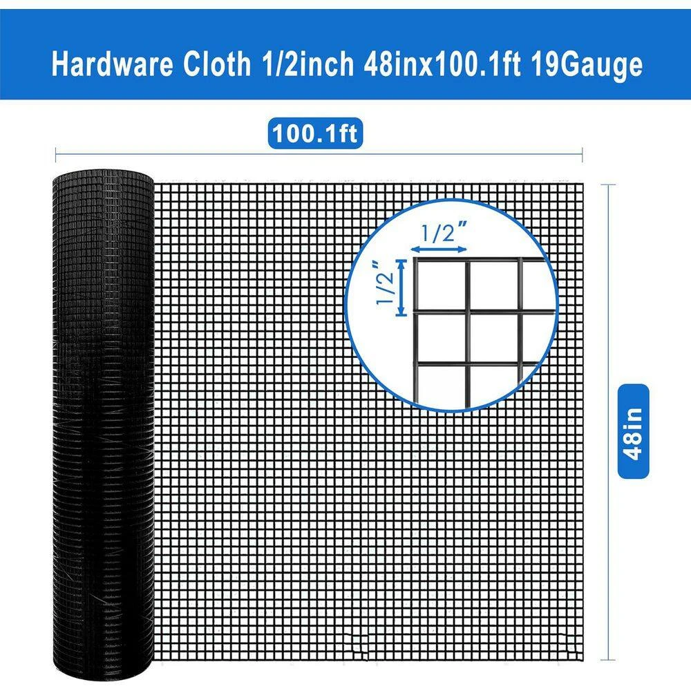 - Discover the versatility of this Black PVC Vinyl Coated Hardware Cloth, measuring 1/2” mesh, 48” W x 100.1′ L, crafted from durable 19 Gauge mild steel wire for robust protection. Ideal for various uses, from chicken coops to garden protection, it effectively keeps out voles, raccoons, and other critters, ensuring your plants and animals are safe.