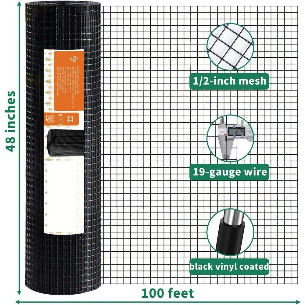 - With a 1/2-inch mesh, 19-gauge wire, and dimensions of 48 W by 100′ L, this black vinyl-coated wire mesh offers a robust solution for a range of uses, from fencing to structural support.