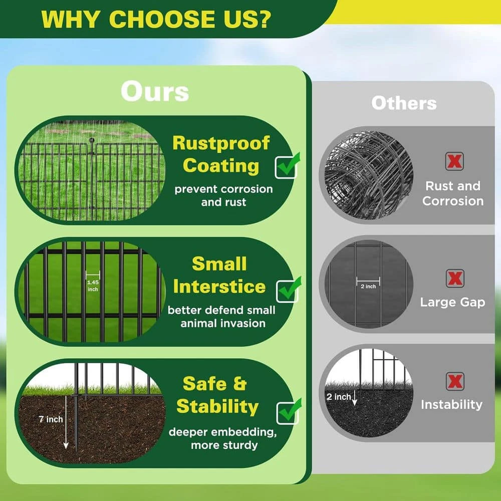- Experience hassle-free setup with no-dig installation; simply push stakes into the ground for a quick, clean, and time-saving process that leaves your yard untouched crafted from rustproof metal, this fencing is designed to withstand the elements, ensuring long-lasting durability and reliable performance throughout the year