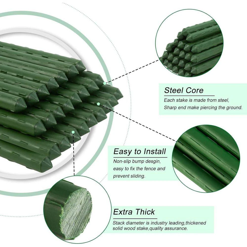 - Product includes 25 steel stakes and 20M twist ties, each stake made of high-quality steel with plastic coating for enhanced durability, offering an affordable alternative to traditional fencing