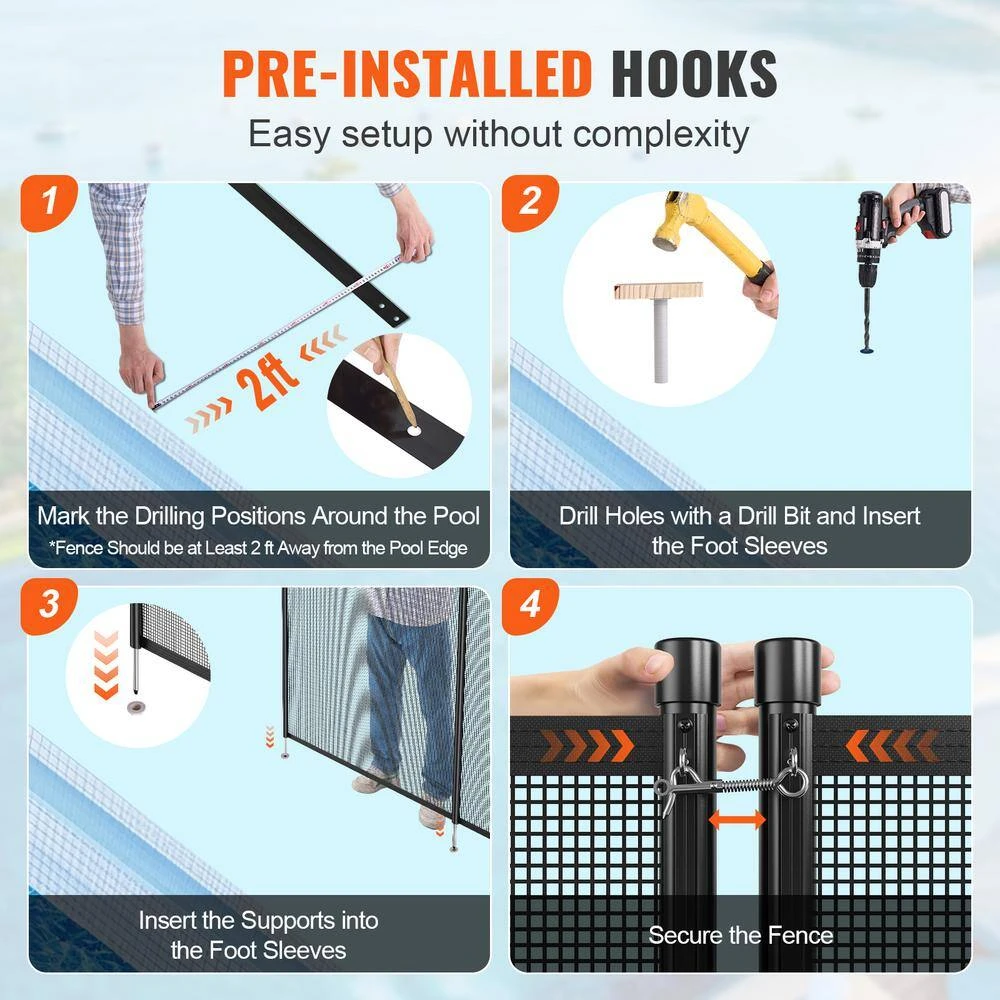 Secure Your Pool with 4 x 108 ft. Pool Fence. Our mesh pool fence provides a tailored safety solution adaptable to various shapes of pools. With multiple accessories, this DIY pool fencing ensures safety not only for your pool but also for pets and children.
