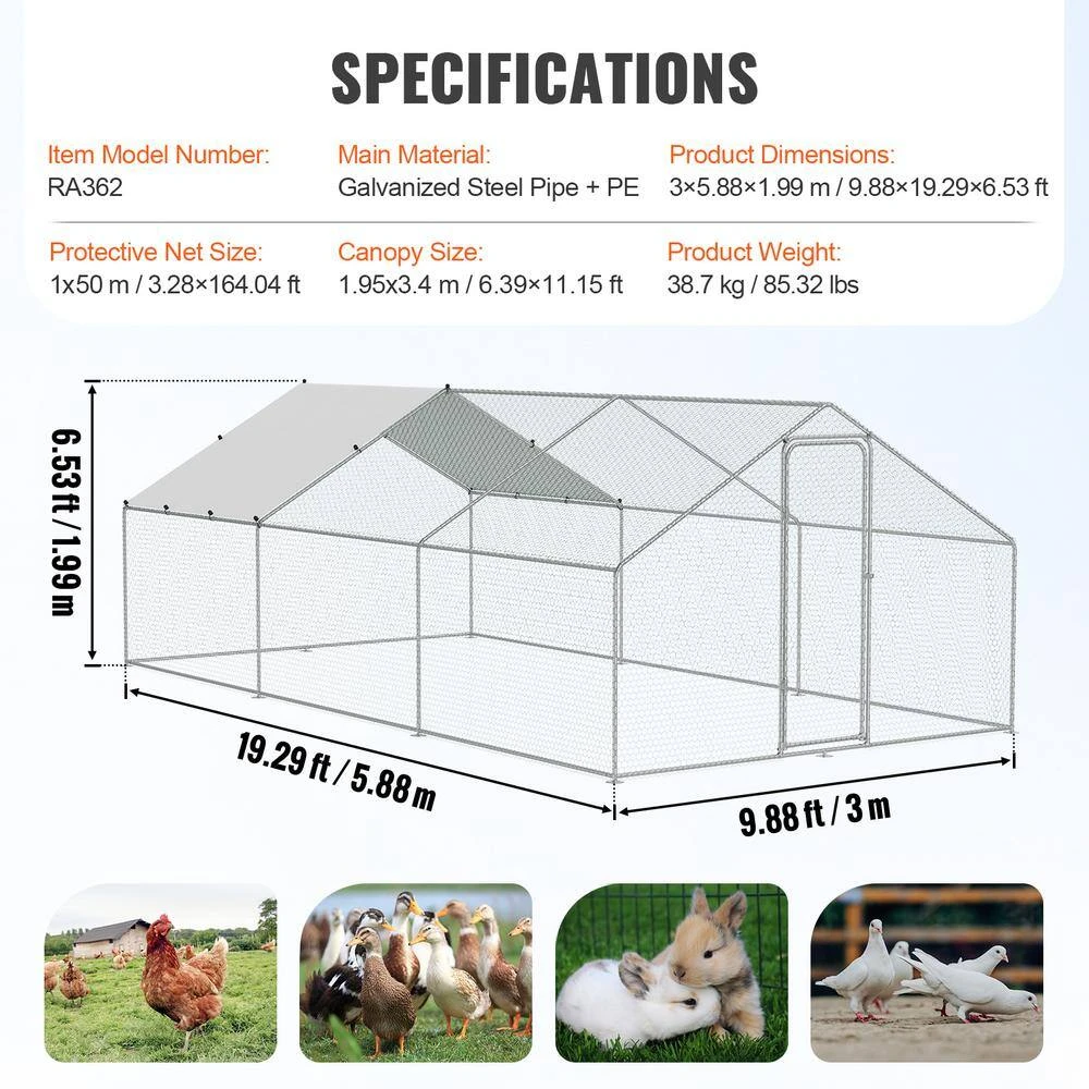 - Spacious living area: offering a generous 3 x 5.88 x 1.99 m/9.88 x 19.29 x 6.53 ft. of space, this metal chicken run features 4-sided ventilation, creating a healthy and comfortable environment, the PE-coated canopy provides sun protection, waterproofing and tear resistance, shielding your poultry from external elements